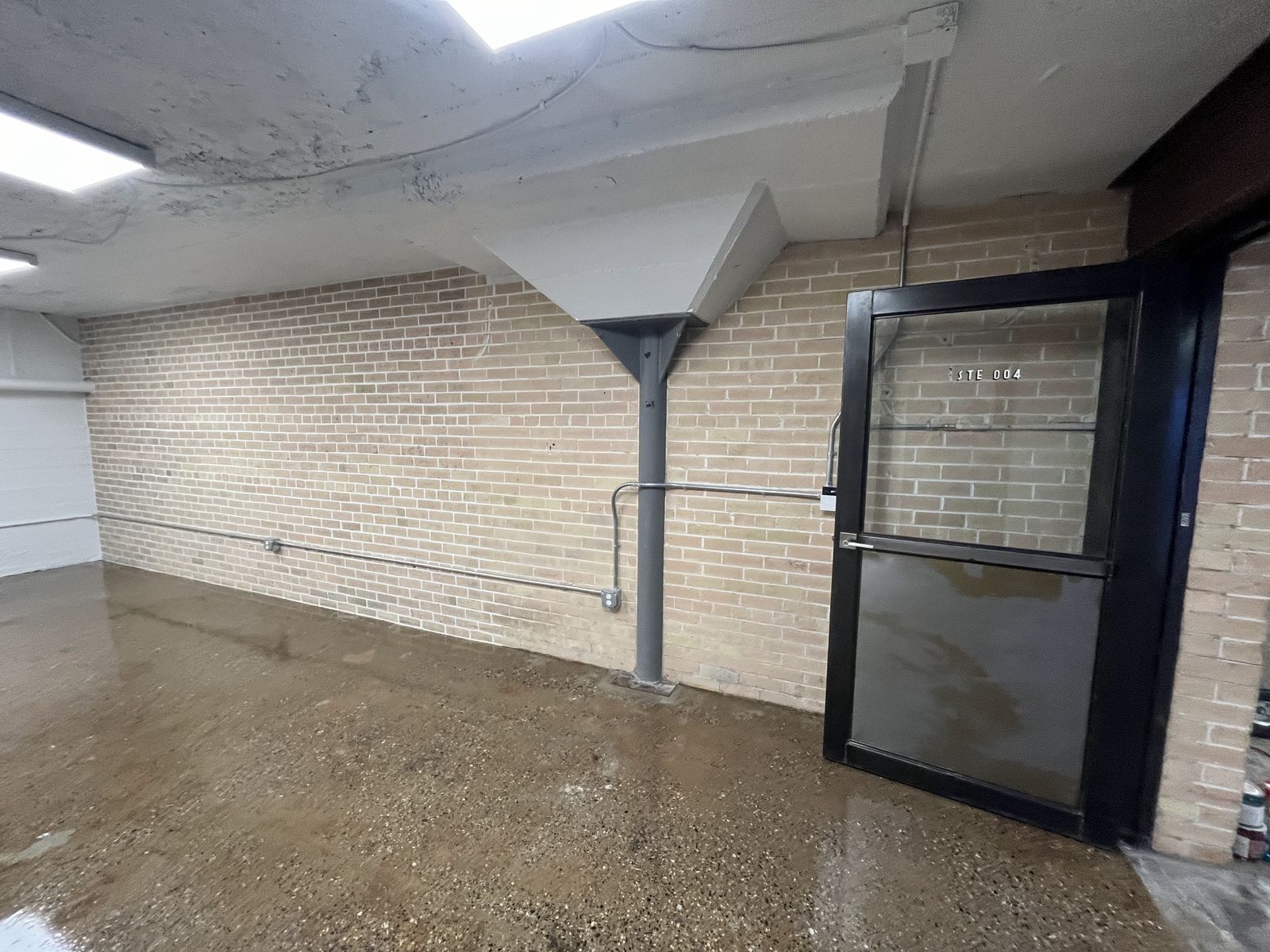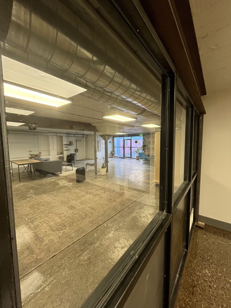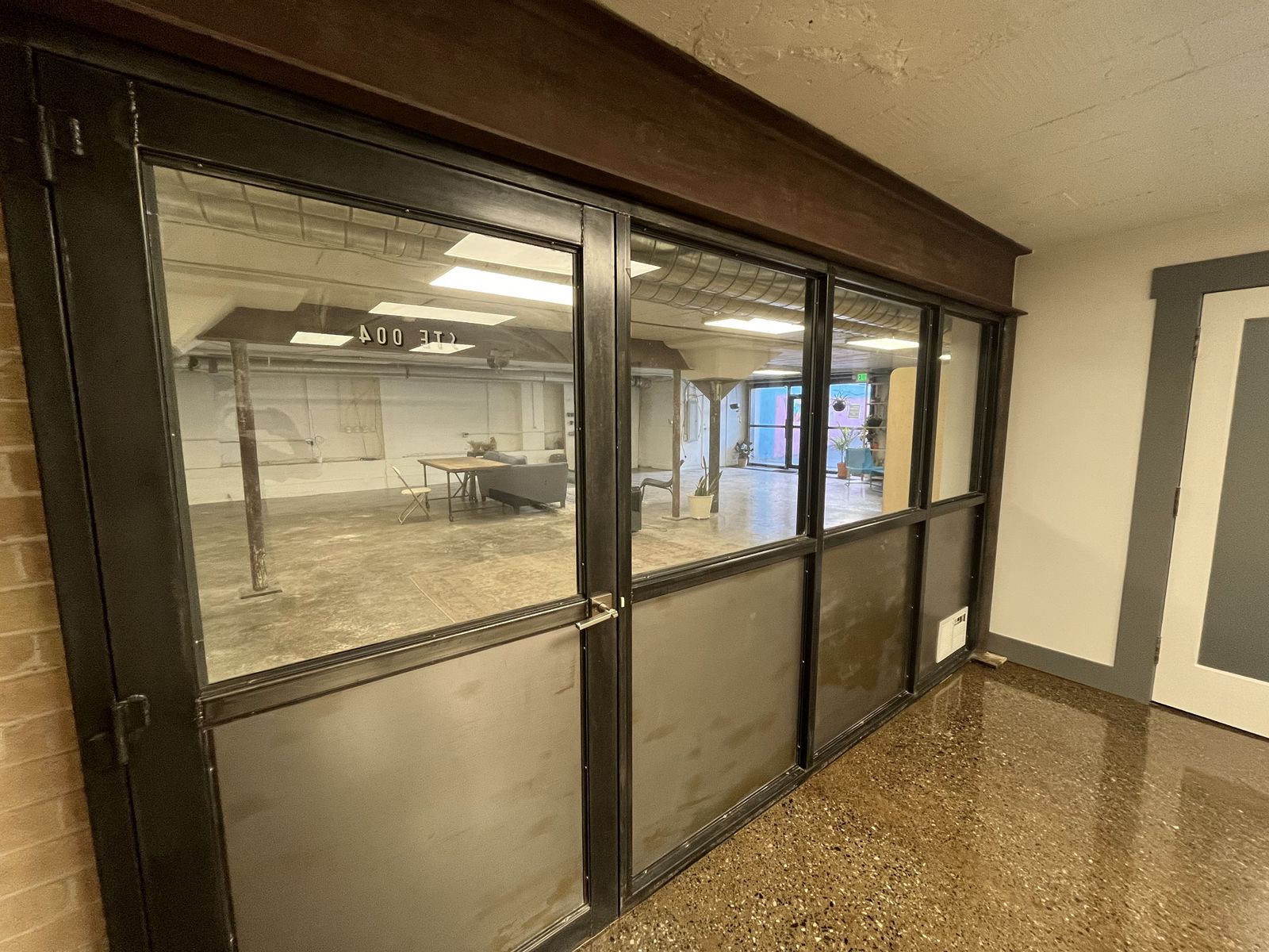 This is a great office over at the Bright Building in downtown Provo. It has cement floors, an exposed brick wall and a cool lsteel and glass front wall/door. While it does not have an exterior window it does get natural light through the front door/glass wall and through to the office windows.