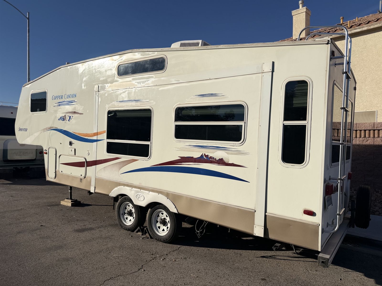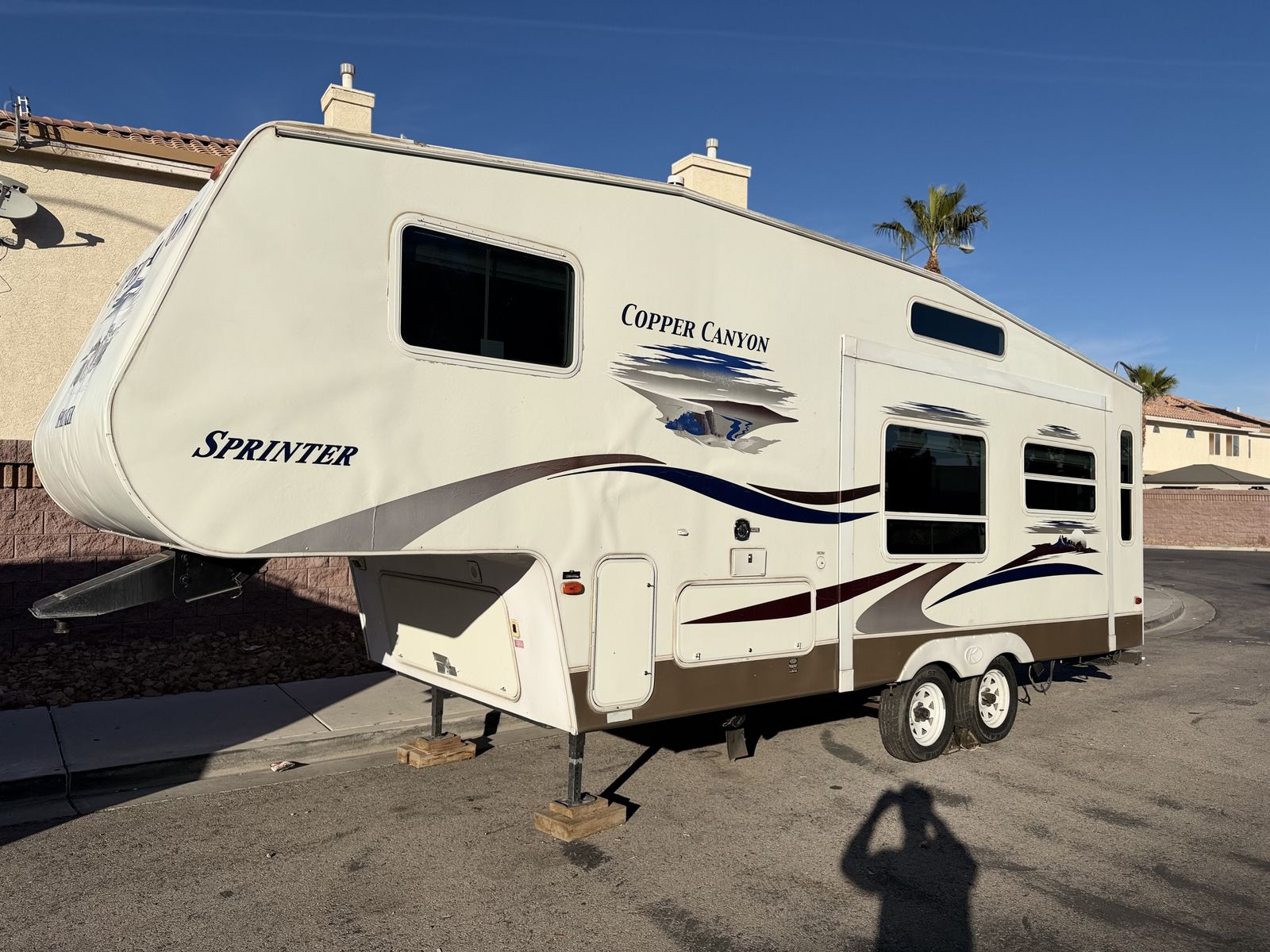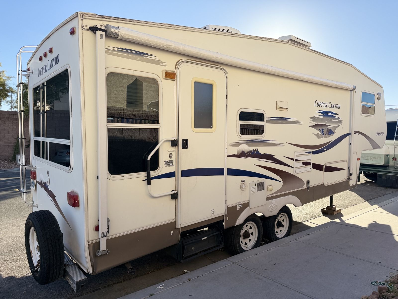 Zelleselling grandpa‘s 2006 copper Canyon by sprinter 5th Wheel double axle with super slide everything works great no issues. AC works heater works. Tires are in good shape. Brand new batteries has a queen size bed room sleeps 6 has a clean Nevada title in hand, axing, 5500 OBO CALL FOR MORE INFO 725-329-0089