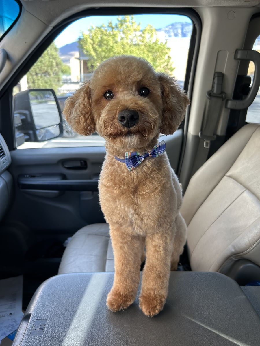 ZelleKoda is an adorable 10 lbs red mini poodle stud with white abstract markings on his chest. He has a playful temperament, loves spending time with family, and going for walks.