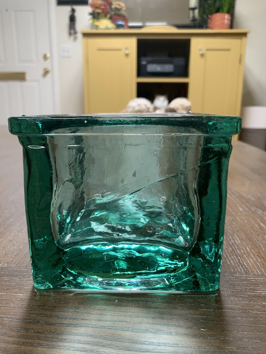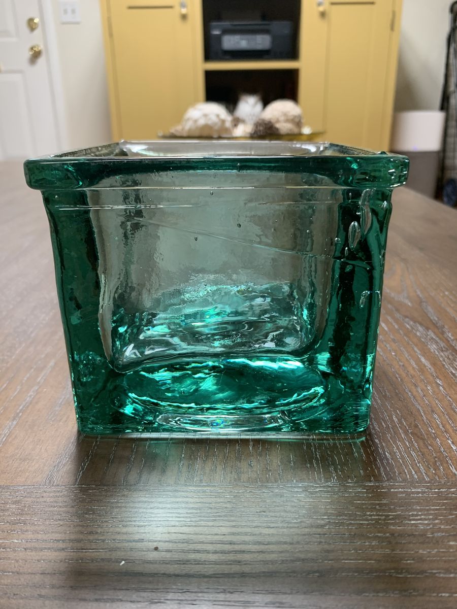 VenmoA stunning 5” glass vase or candle holder from Spain. A square block shape with a textured, ice-block design. Use as a vase, planter, or candle holder. Made of heavy, thick glass. Weighs 4lbs. Clean and ready to go. Venmo or Cash. Venmo to hold. Non-smoking/No pet home.