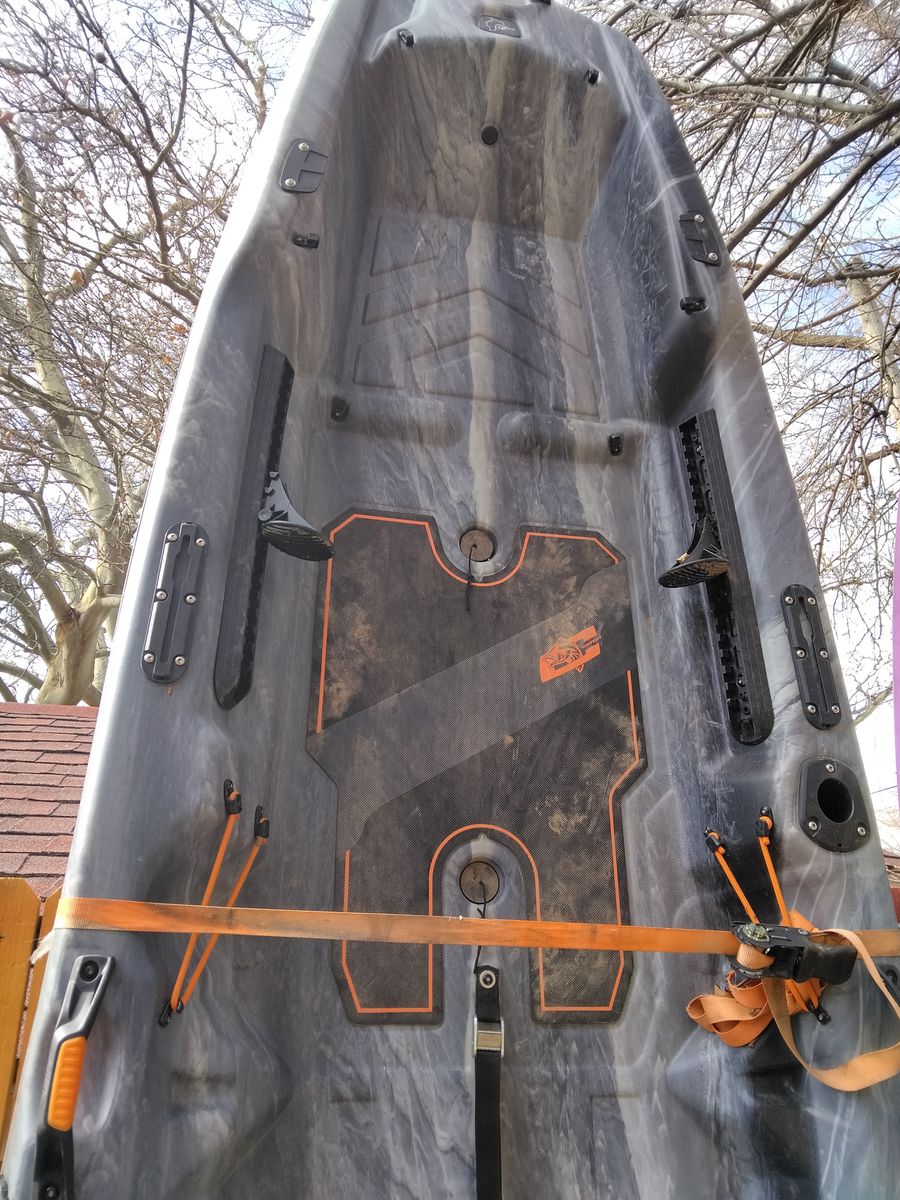 Purchased new less than a year ago. Seat is detachable as to why not on the kayak in the pictures. The seat does sit down in the kayak.