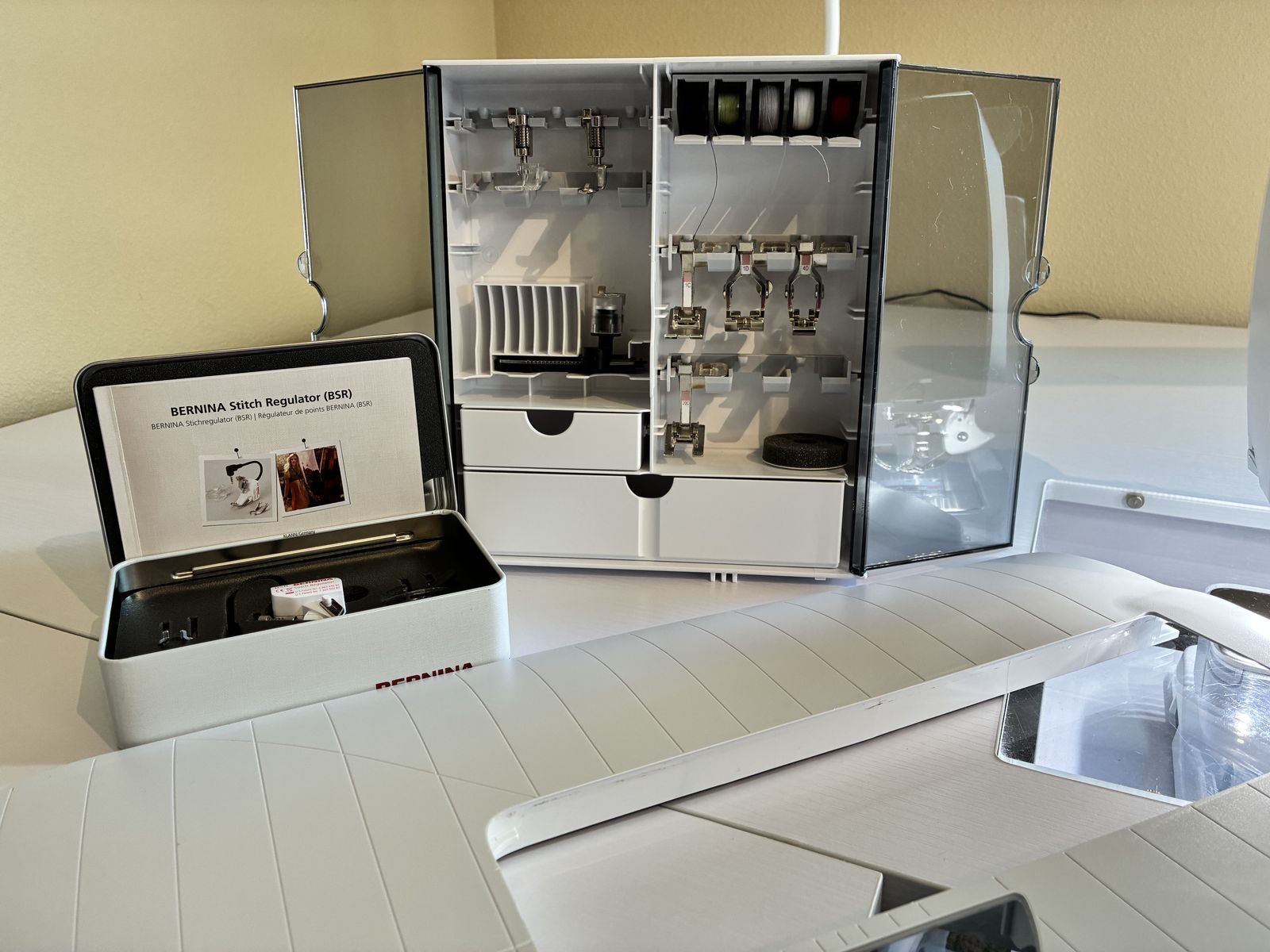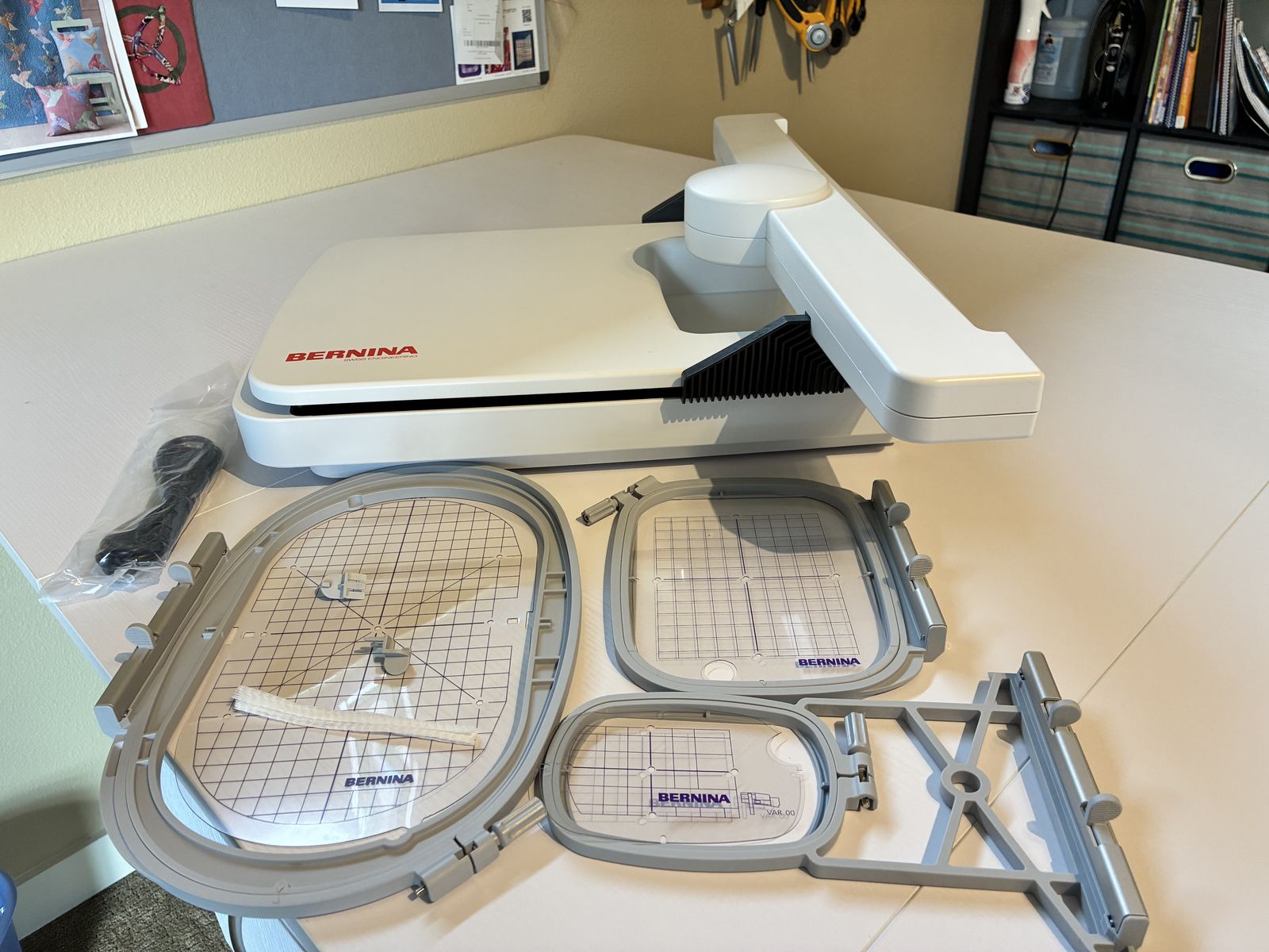 Sewing machine includes – Never used BSR, slide-on free-arm extension table, hands free system, accessory box, bobbins and stylus.