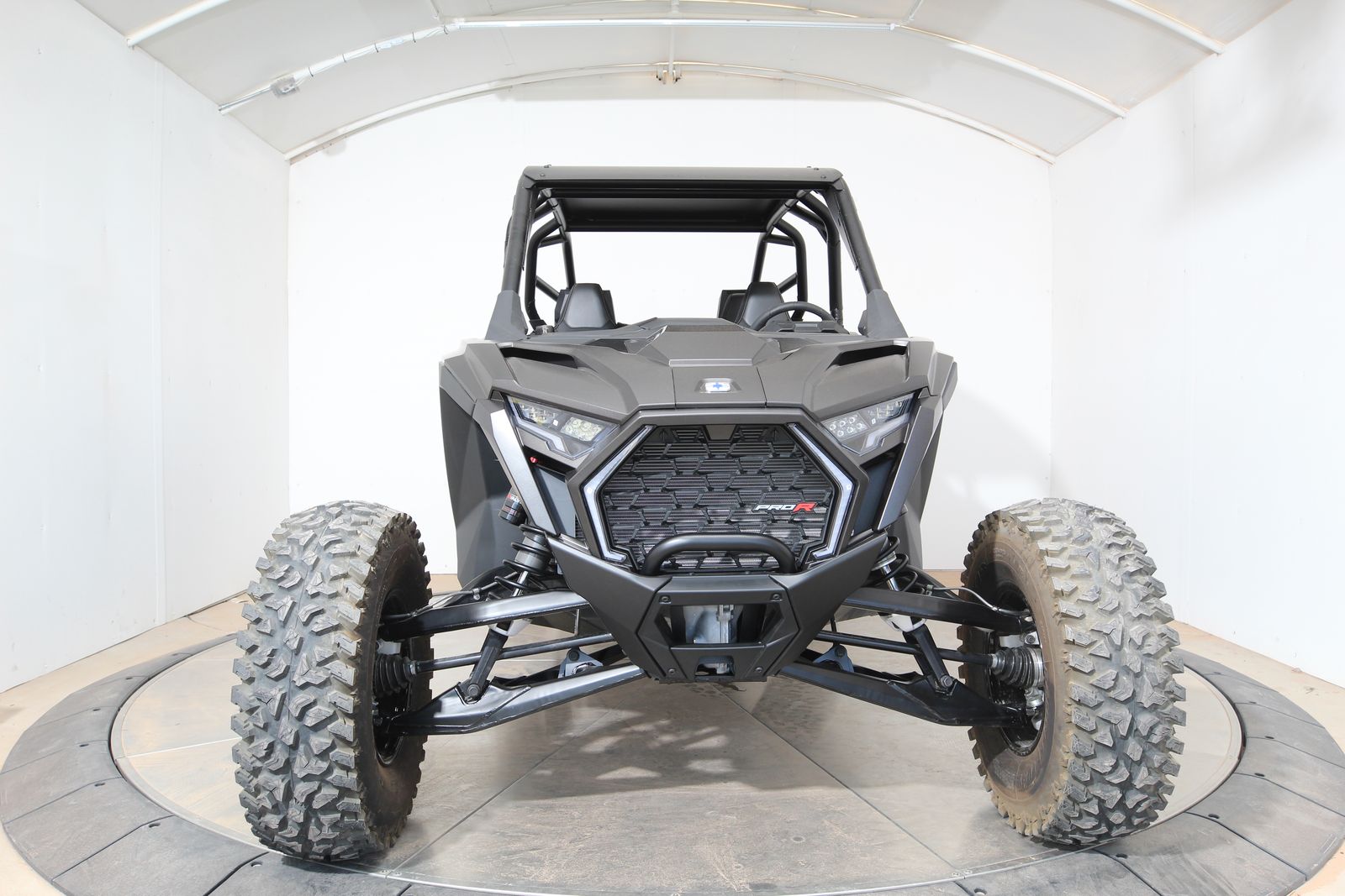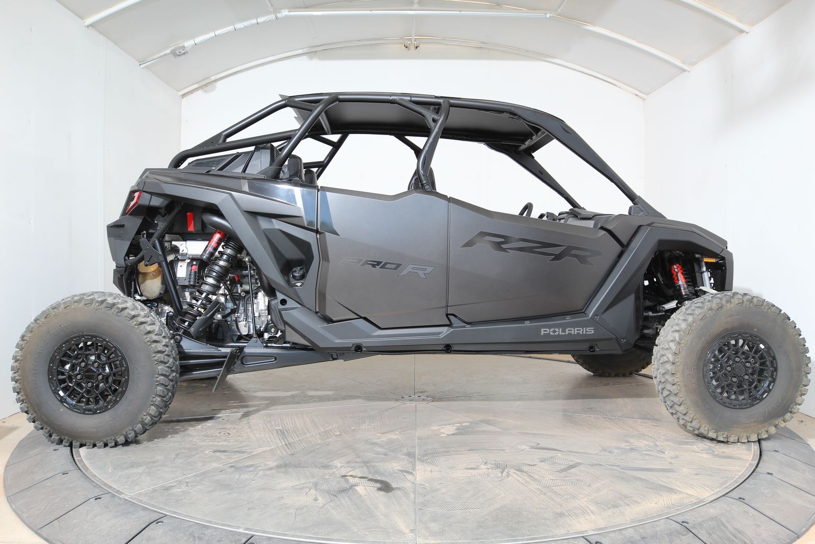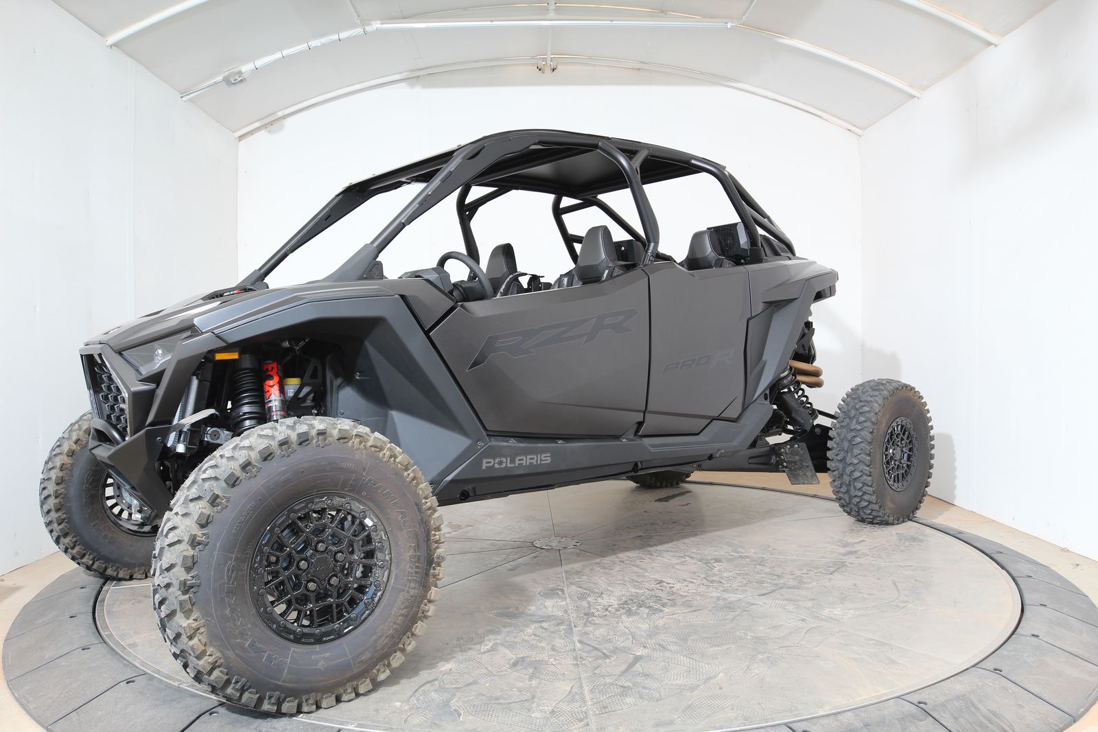 Up front, fresh air intakes help maintain cabin comfort while Pro Climate Heat & Vent seats make temperature control a breeze. New animated RZR Fang accent lighting adds an extra layer of visual swagger, and a painted front fascia and center hood give the Pro R a standout finish. The 5-lug color-matched beadlock wheels, along with FOX 3.0 Live Valve X2 internal bypass shocks and the DYNAMIX DV suspension system with four selectable ride modes, make sure this beast responds to terrain like nothing else out there.