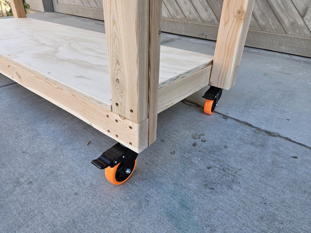 Includes 4 lockable casters, all joints and surfaces glued and tightly screwed together.