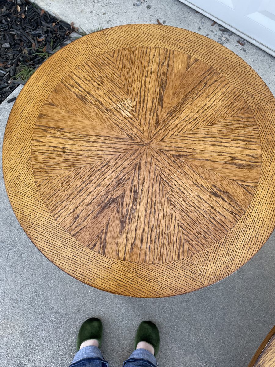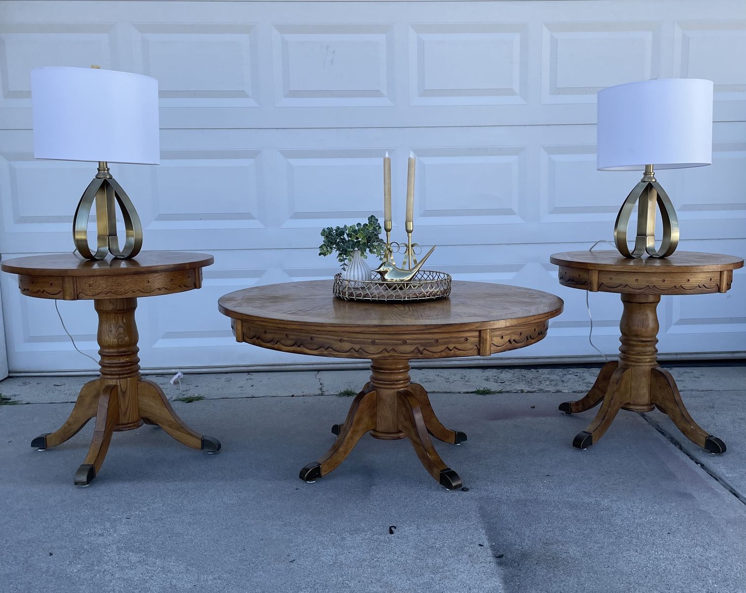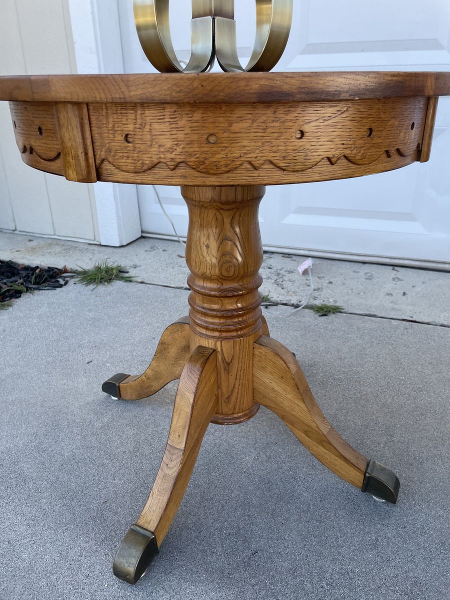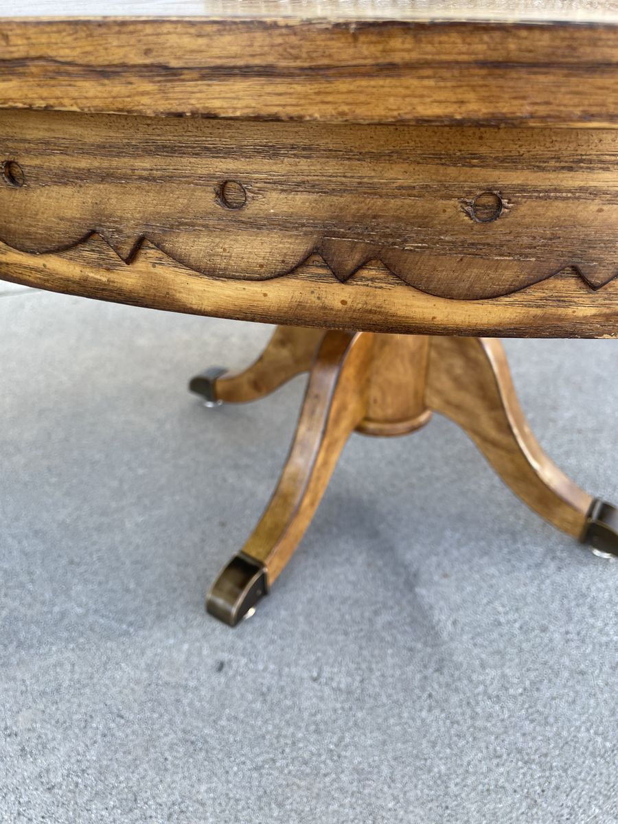 This charming set is all wood with decorative details around the sides. Pedestal legs with brass accents on feet. $200 Location is Sandy, Call or message Ang 435-350-2559