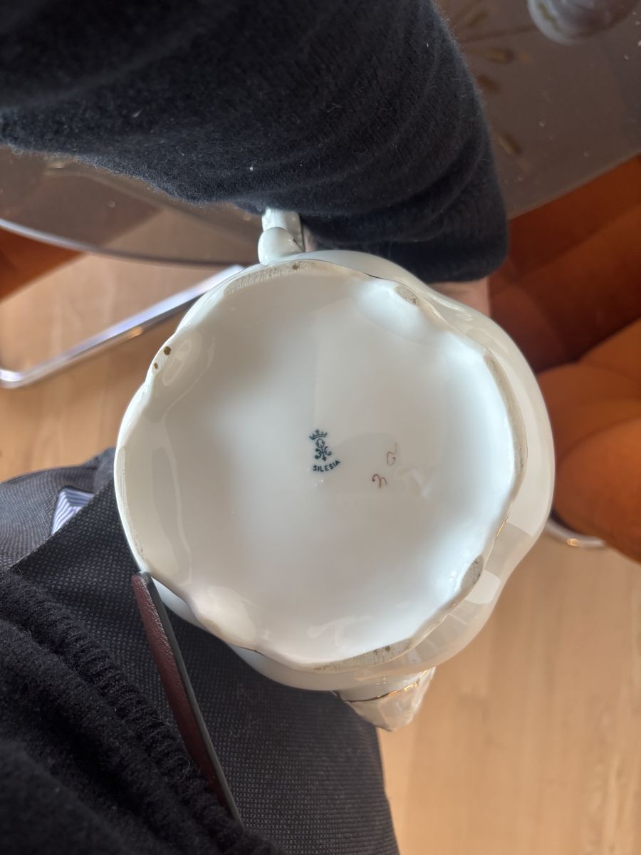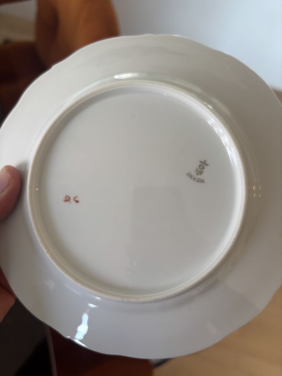 PayPalBeautiful and rare 36-piece antique porcelain tea and dessert set from Porzellanfabrik Koenigszelt (P.K. Silesia). This set features a delicate green floral wreath pattern with scalloped, embossed edges and gold-rimmed accents. Based on the P.K. Silesia backstamp, these pieces date to approximately 1914–1922.