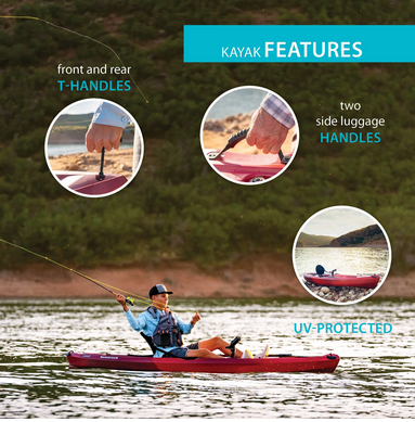 Adjustable Padded Seat Back and Seat Pad for Comfort Hatch for Added Storage Beneath the Deck Two Flush-Mounted Fishing Rod Holders One Adjustable Fishing Rod Holder Deep Hull Channels for Tracking Performance and Chine Rails for Stability Front and Rear Shock Cords Multiple Footrest Positions for Different-Size Paddlers Front and Rear T-Handles for Easy Transport Deep Hull Channels for Tracking Performance and Chine Rails for Stability Constructed of UV-Protected High-Density Polyethylene Stable, Flat Bottom One Top Mount Fishing Rod Holder Two 6-Inch Storage Compartments in Rear and Center Paddle Keeper to Secure Your Paddle to the Kayak Paddle Sold Separately Color: Azure Blue Draft: 5 in. Height: 14 in. Hull Material: High-Density Polyethylene (HDPE) Length: 120 in. Maximum Weight Capacity: 275 lbs. Weight: 51 lbs. Width: 31 in.