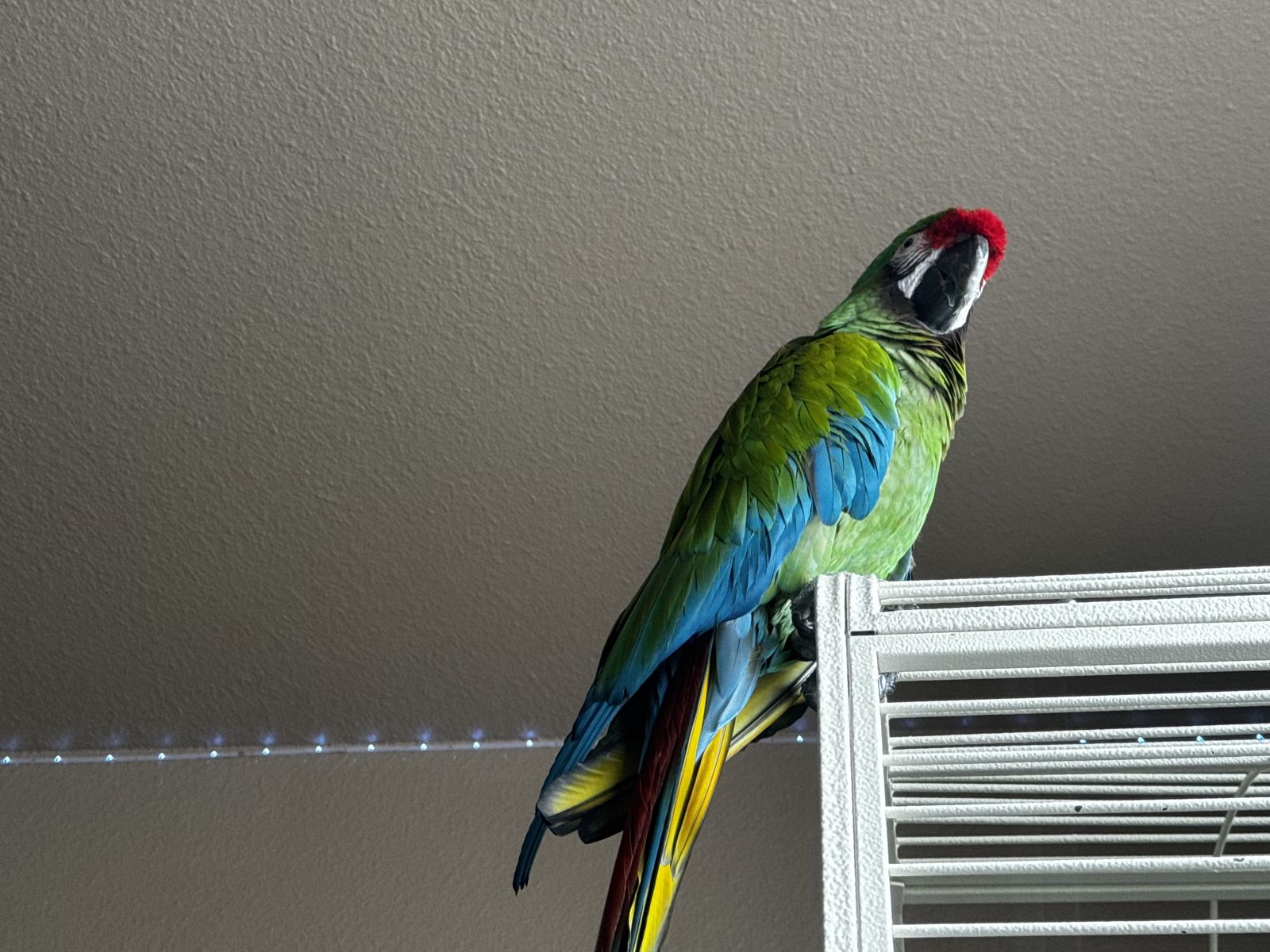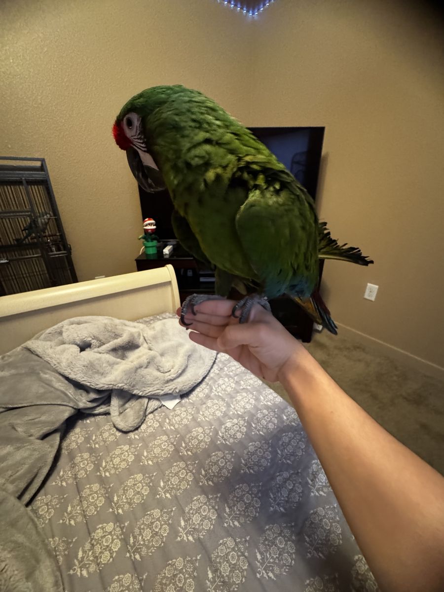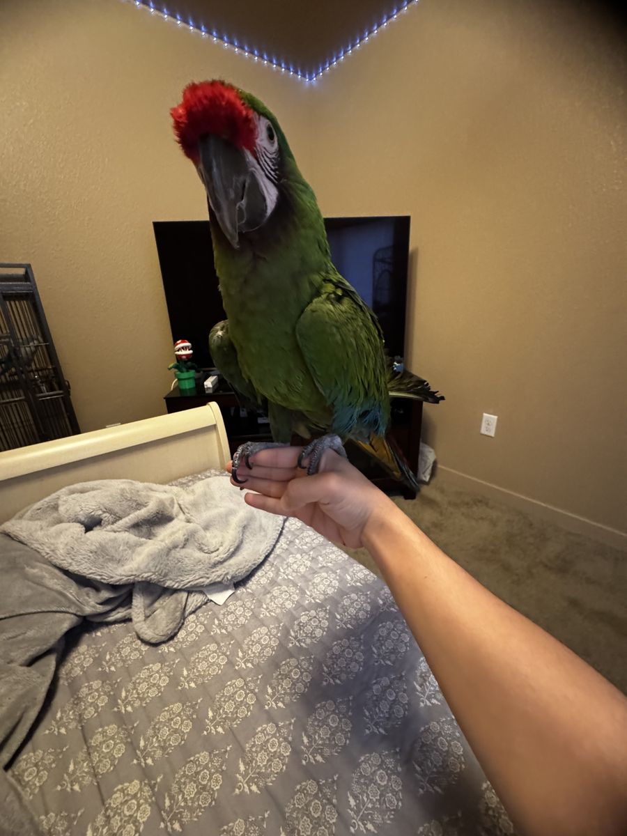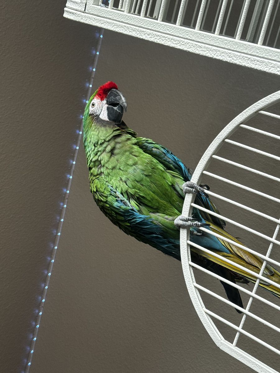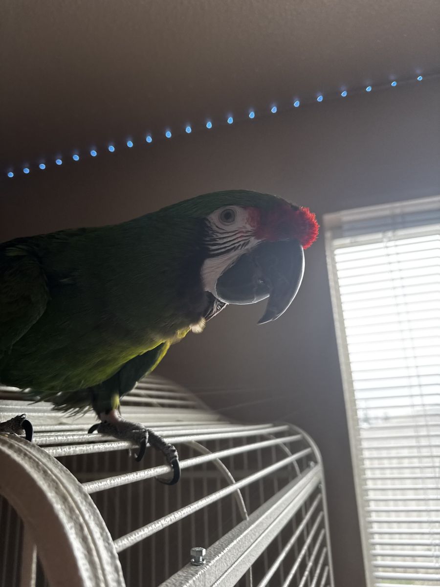This is bowser he is 40 years old he does talk he says hello, bowser, step up, shut up. He is very healthy and and he does step up on your arm/hand he is not a loud bird he prefers calm environment and to relax mainly in his house or on top of it his diet is Roudybush Pellets, mixed fruits and nuts and I wouldn’t really recommend keeping him around other birds or animals cause he will attack ONLY IF THEY INTERFERE WITH HIS SPACE other than that he doesn’t mind birds/animals in the same house.