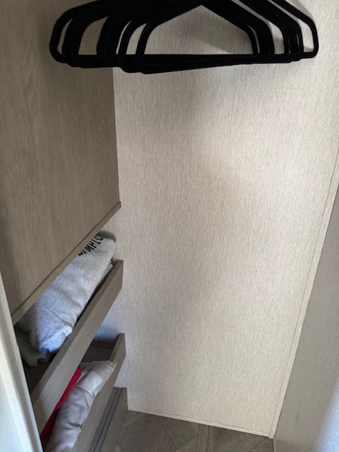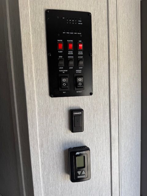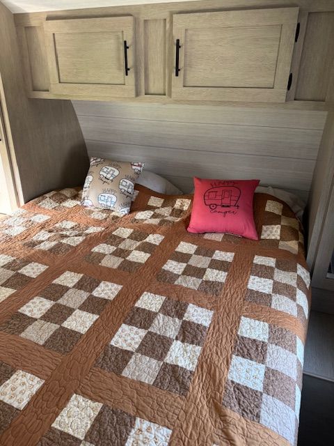 King size bed (quilt in the bed picture is not included); roof AC; microwave; couch/sofa; 2 recliners; outside stove and shower; full pantry; walk in bedroom closet along with side bed closets; sleeps 4 to 6; 1 slide out; fresh water tank 40 gals; grey water tank 54 gals; black water tank 30 gals; propane tank 40 lbs.