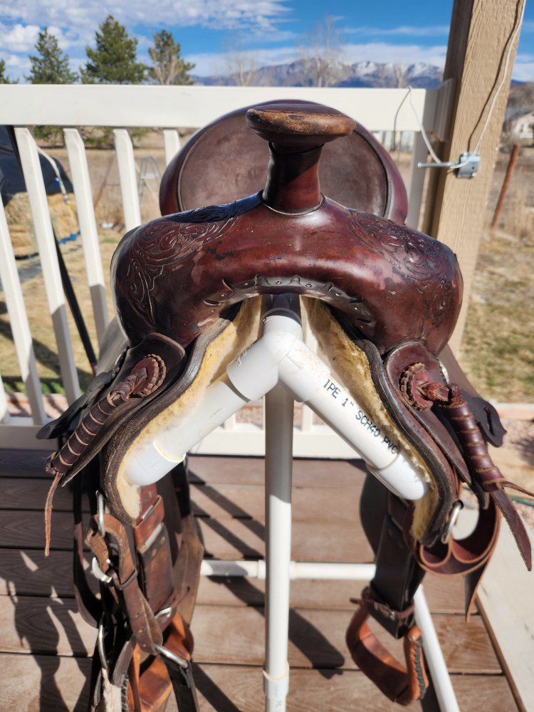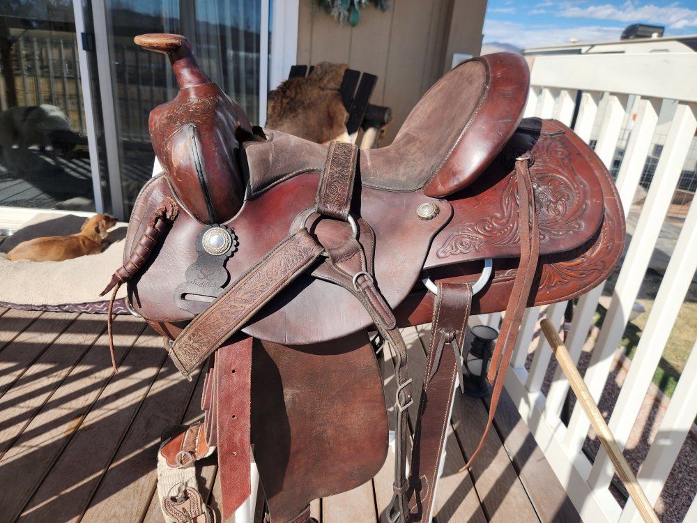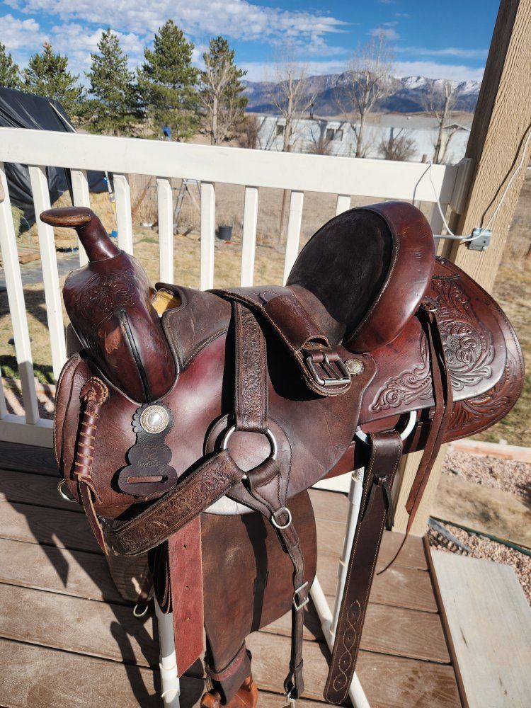cleaned oiled and conditioned ready to go! comes with front/back cinch and breast collar. im down sizing and this one doesnt fit the horses i work with. 15inch seat 6inch gullet. semi quarter horse bars.