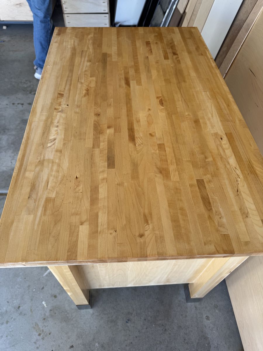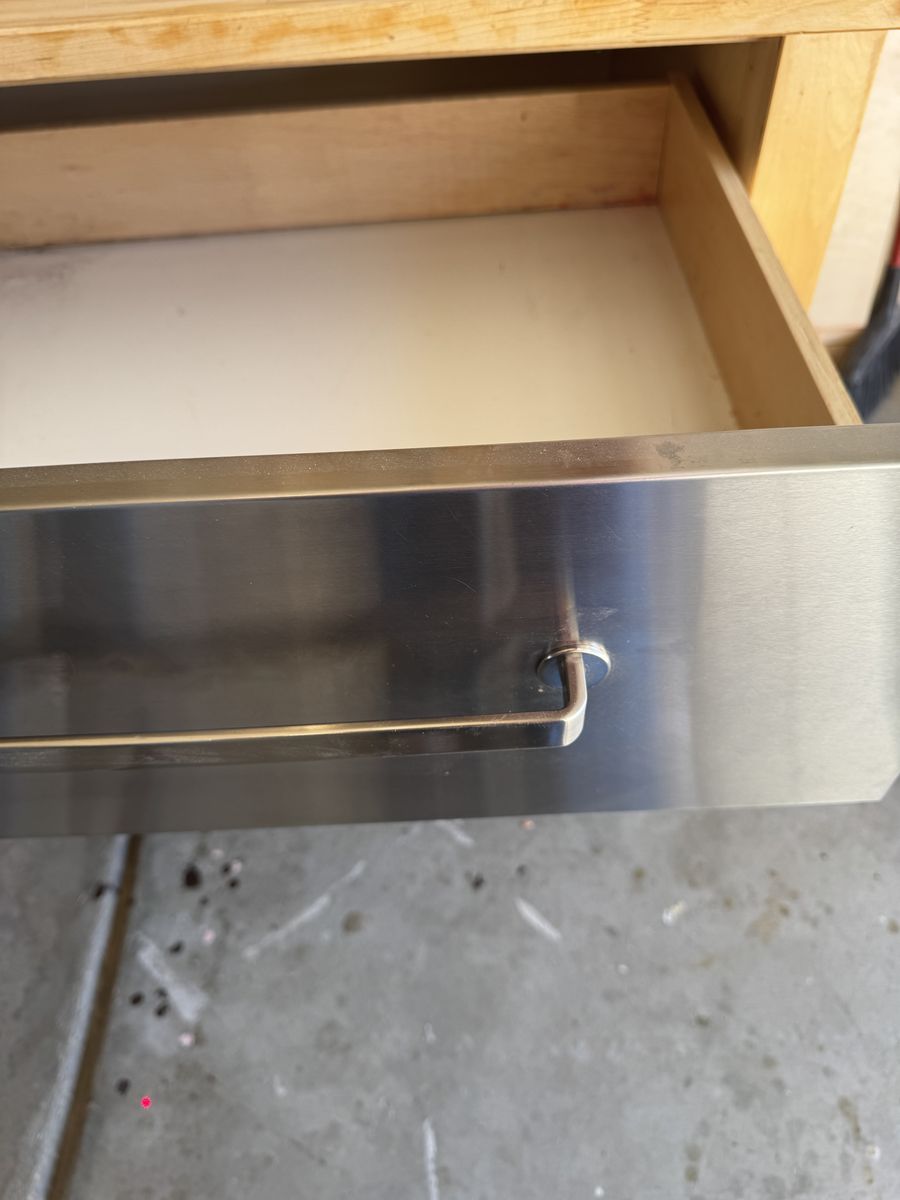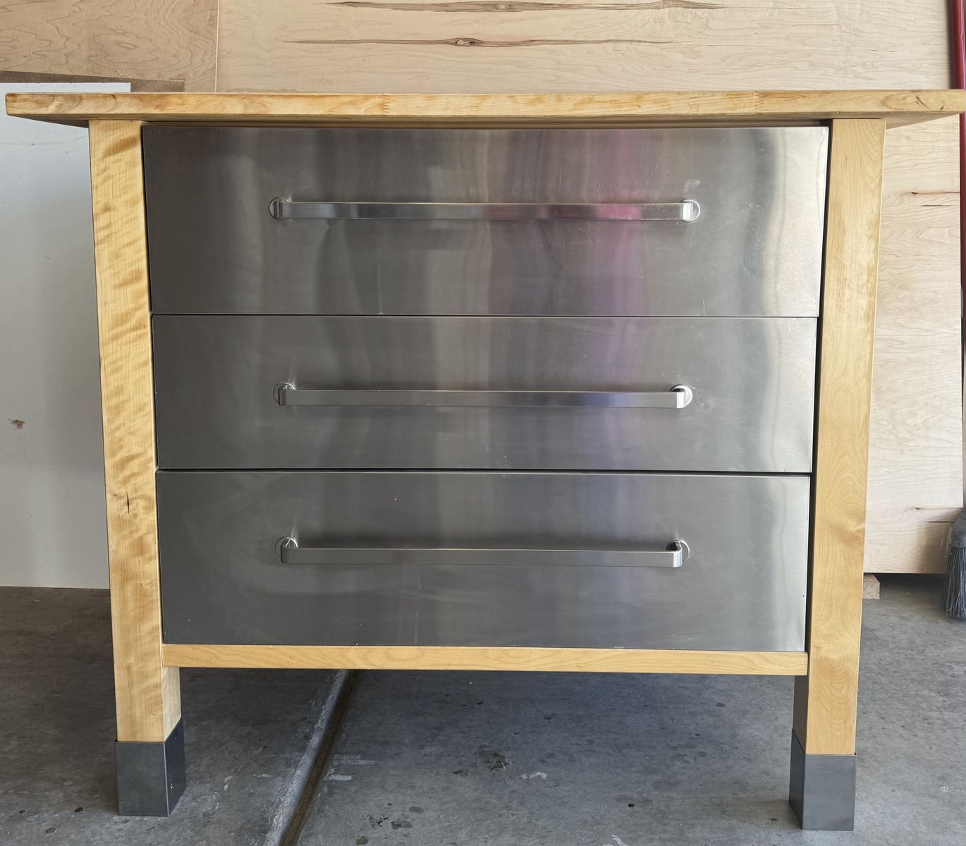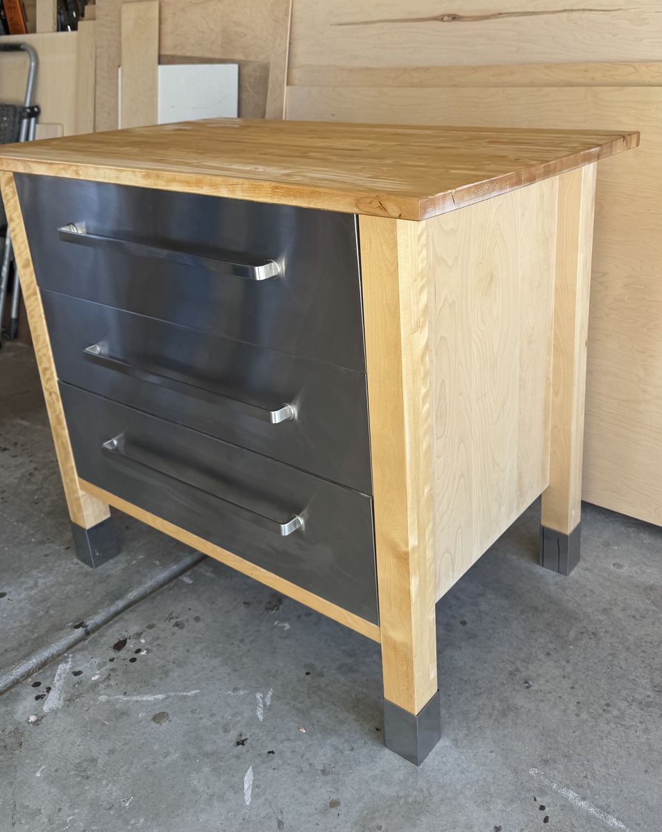 VenmoLovely and functional butcher block buffet with stainless steel drawers. Provides ample drawer space to put utensils, dishes and linens. Can also be used in an entry way. A solid piece of furniture. Measurements: Butcher block top- 41 3/4 x 25 3/4 Height- 35 1/2 “ W- 36 1/2 “ D- 23 1/2”