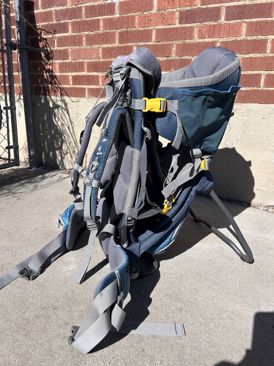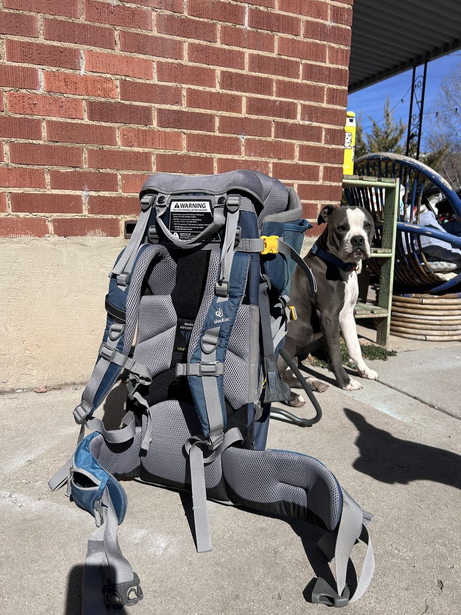 VenmoHiking season is just around the corner, so now's the time to gear up! This Deuter Child Carrier backpack was only used a few times. The pack has soft padding all around, lots of pockets, foot stirrups, a kick stand, and more. Our son loved being in it. The pack can hold a child weighing between 20-50 lbs and is adjustable to fit adults of any size. We bought it for $320 a few years ago. Come snag it while you can! *Cute pup in photos not for sale ;)