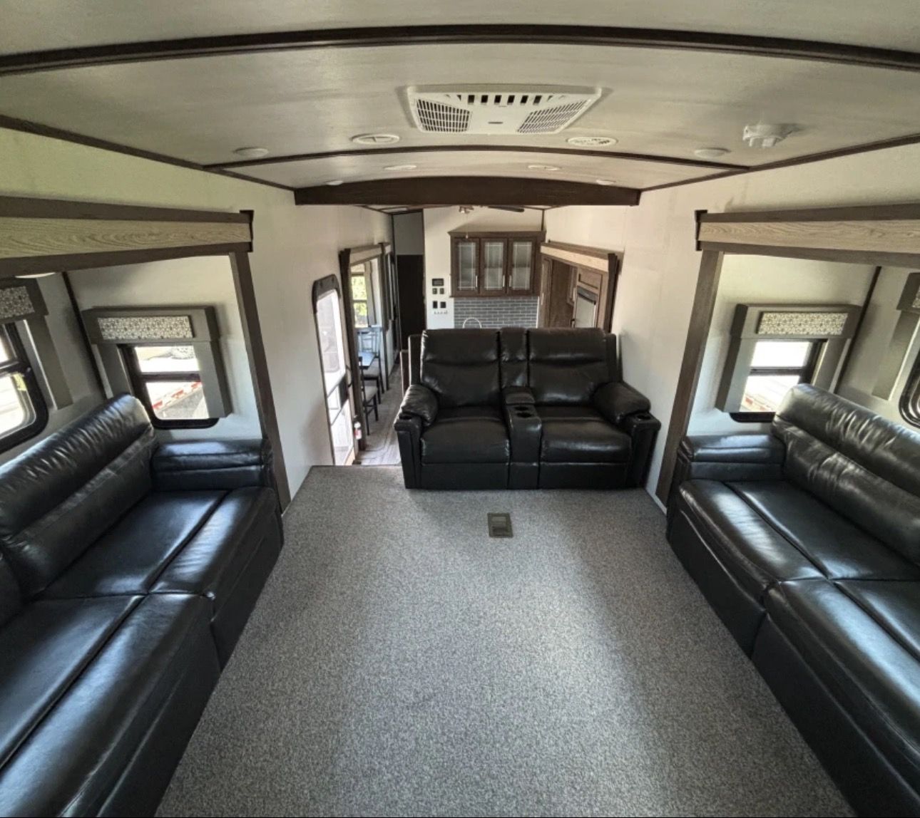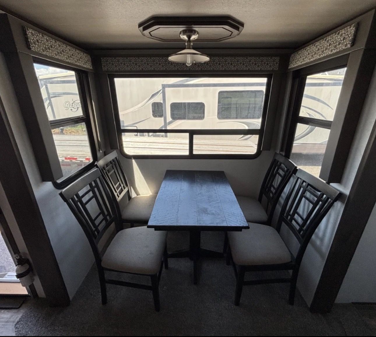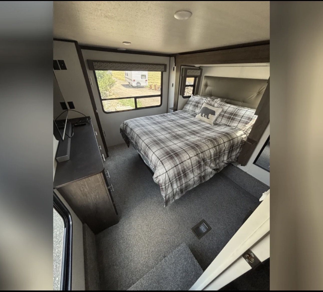 This fifth wheel trailer is perfect for long road trips or weekend getaways, offering plenty of storage space for all your belongings. The large windows allow for plenty of natural light to flood the living area, creating a bright and inviting atmosphere.