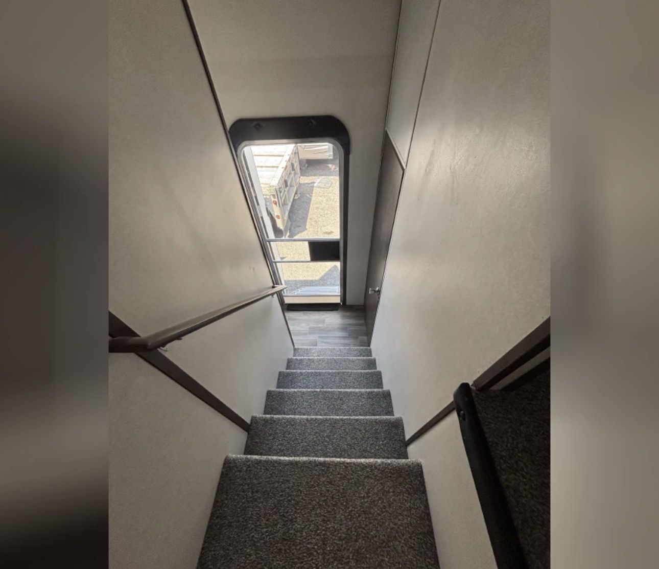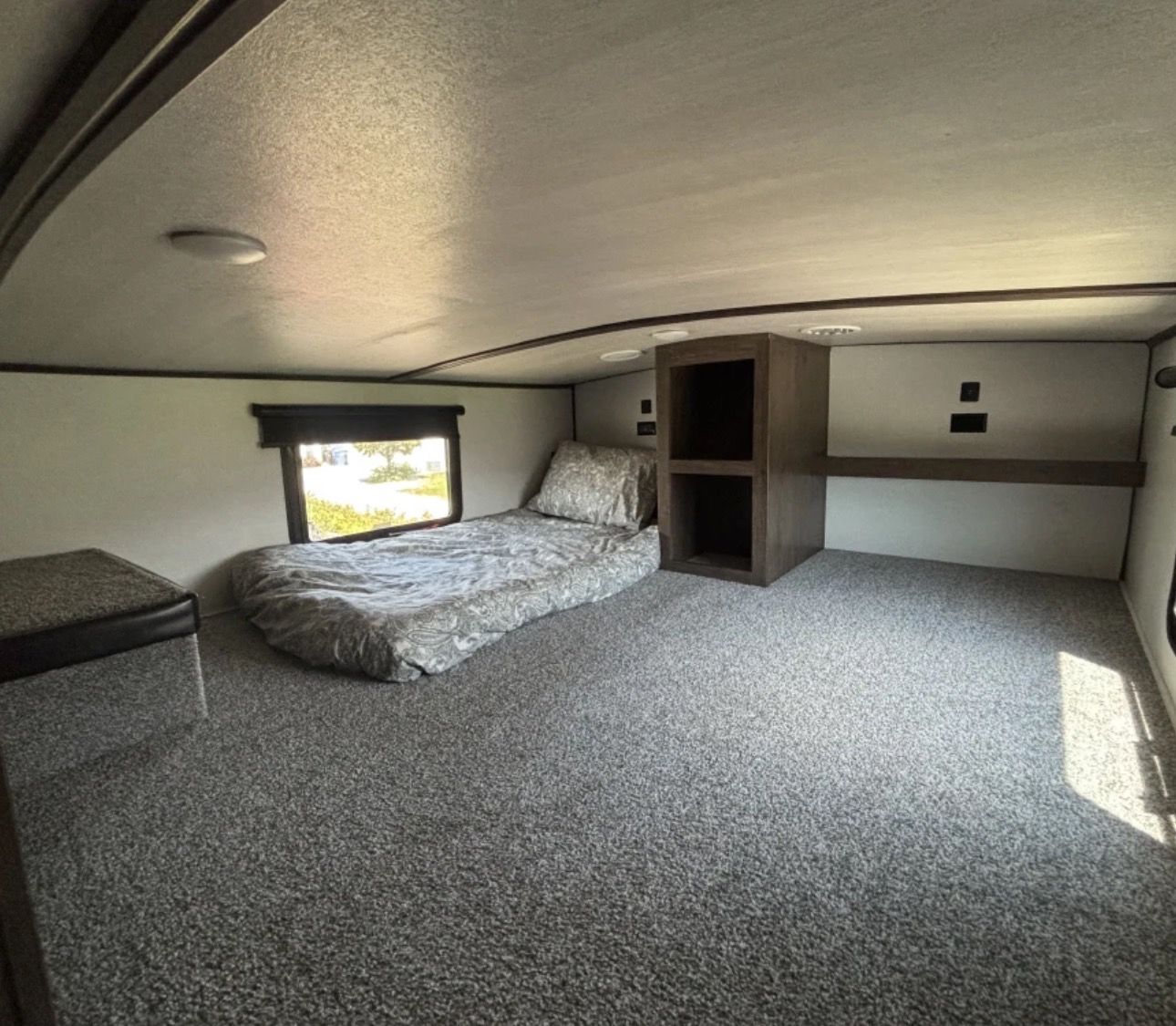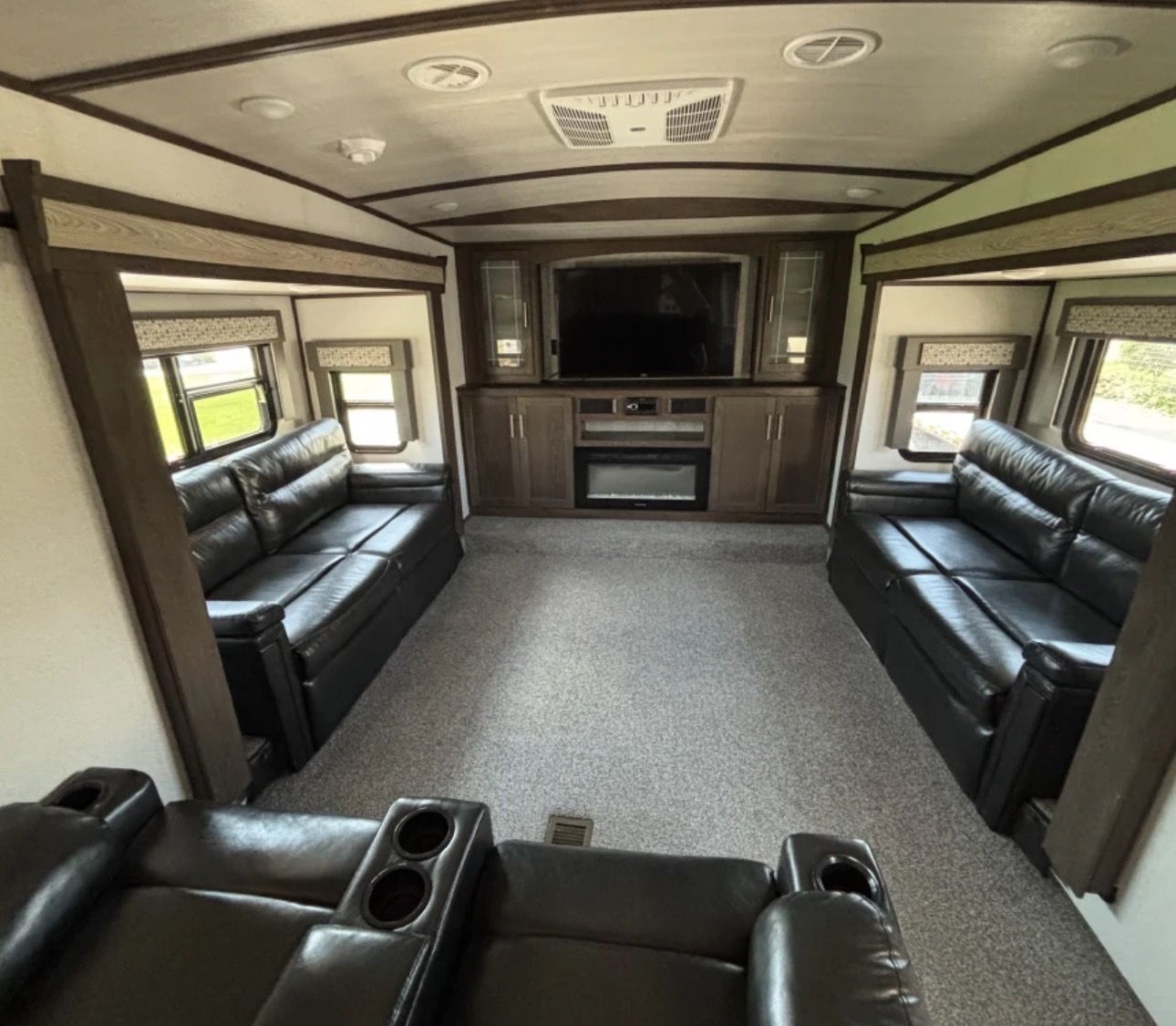 This fifth wheel trailer is perfect for long road trips or weekend getaways, offering plenty of storage space for all your belongings. The large windows allow for plenty of natural light to flood the living area, creating a bright and inviting atmosphere.