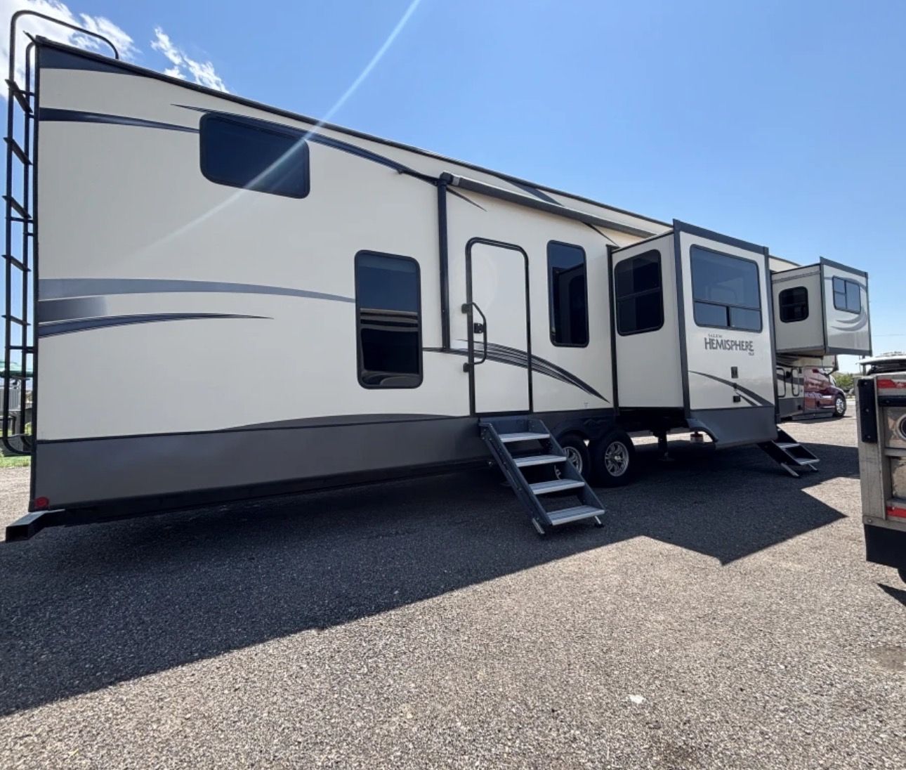 GooglePayThe 2019 Forest River Hemisphere 378FL is a luxurious fifth wheel trailer designed for those who appreciate comfort and style while traveling on the road. This model offers ample space for living and sleeping arrangements, making it an ideal choice for families or couples looking to explore the great outdoors in comfort.