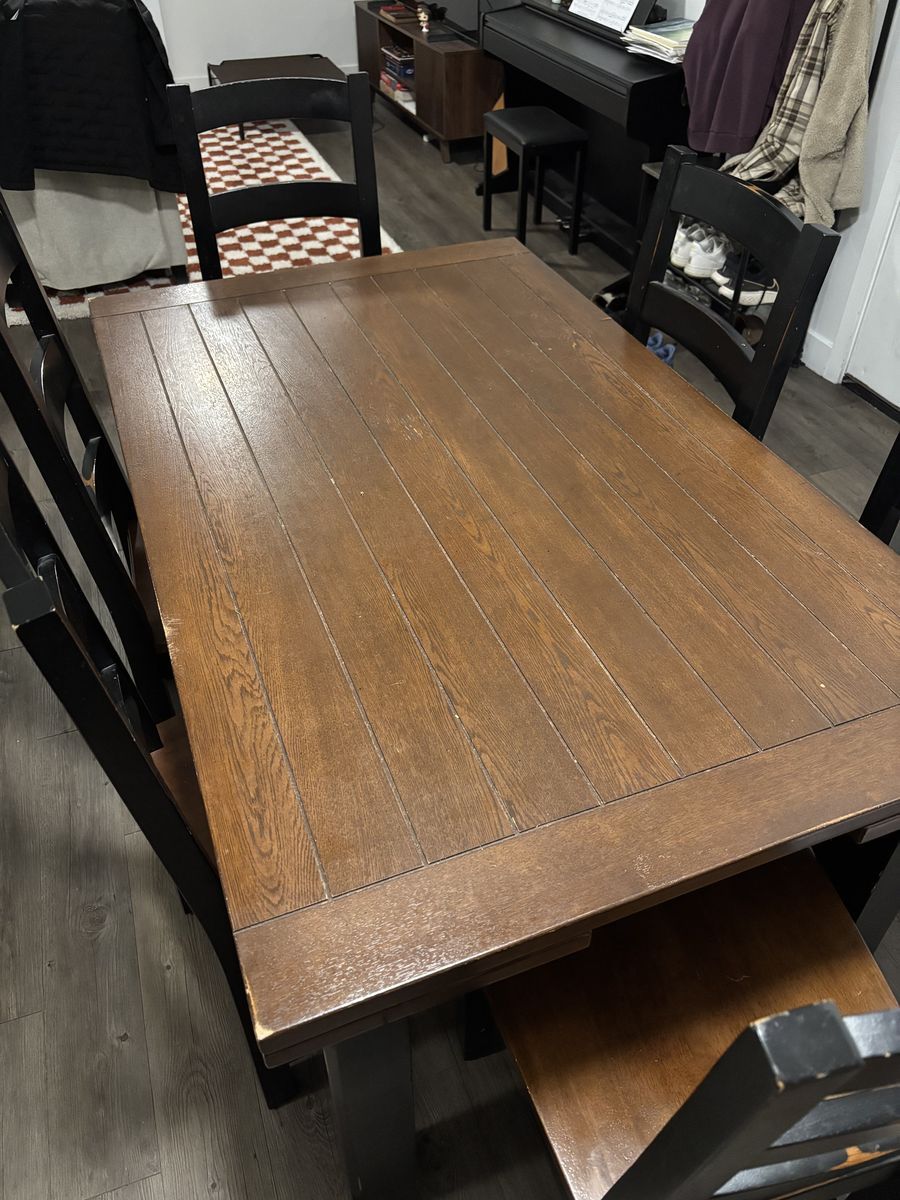 VenmoEverything is in super good condition! Just has a few minor scuffs here and there but other than that it's as good as new! One chair leg just needs a padding on the bottom.