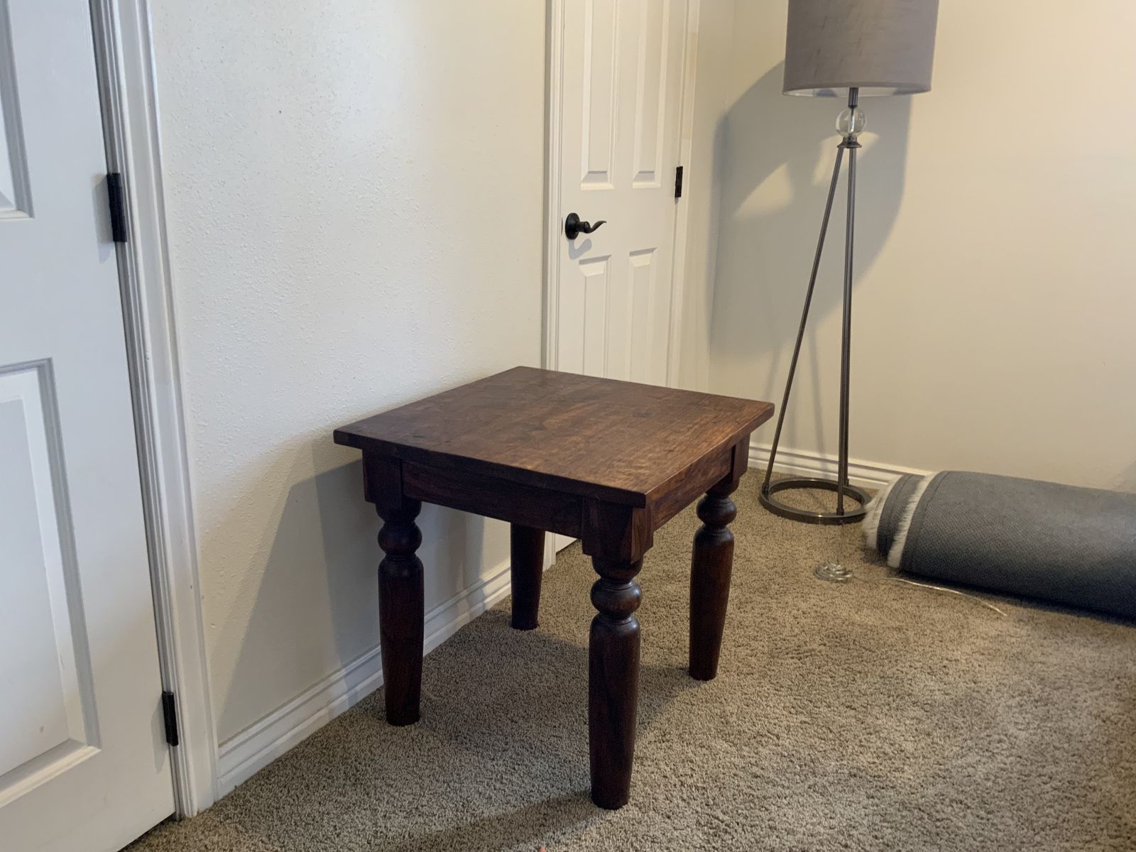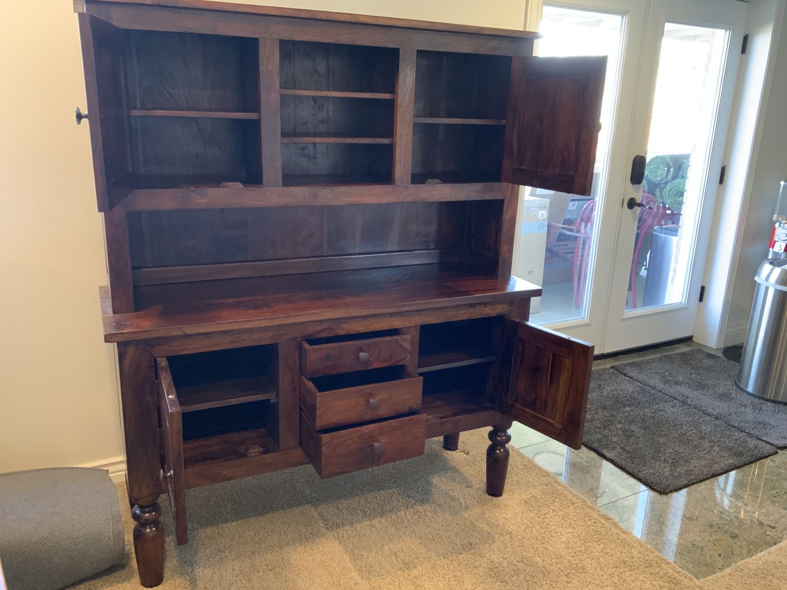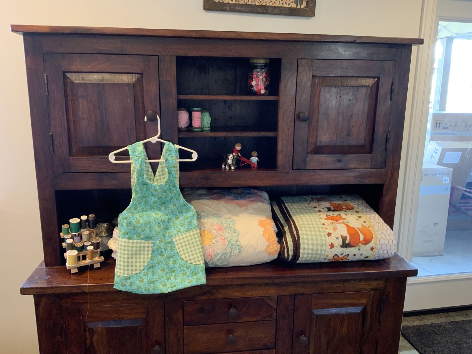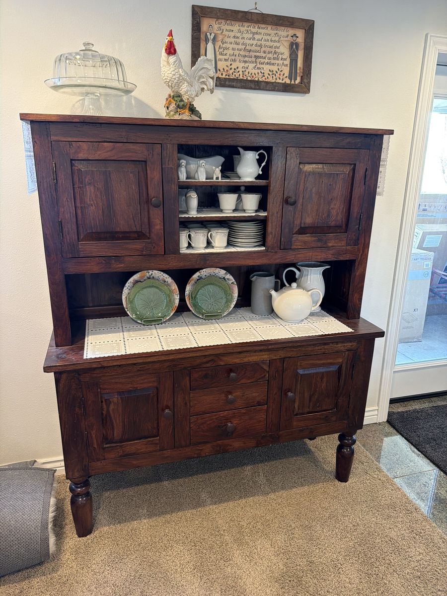 Solid wood, traditional early American hutch, and matching side table. Clean straight lines, No ornamental curves, 65“ tall, 54” wide, upper cabinet 3 shelves, 2 doors with shelves inside, counter top 18” deep, 3 drawers, 2 doors with shelves inside. No scratches, no stains, beautiful hutch in excellent condition. Useful in many ways, quilts, crafts, kitchen, garden, boutique display, $500.