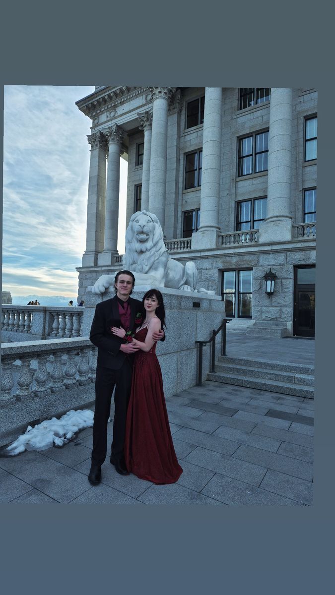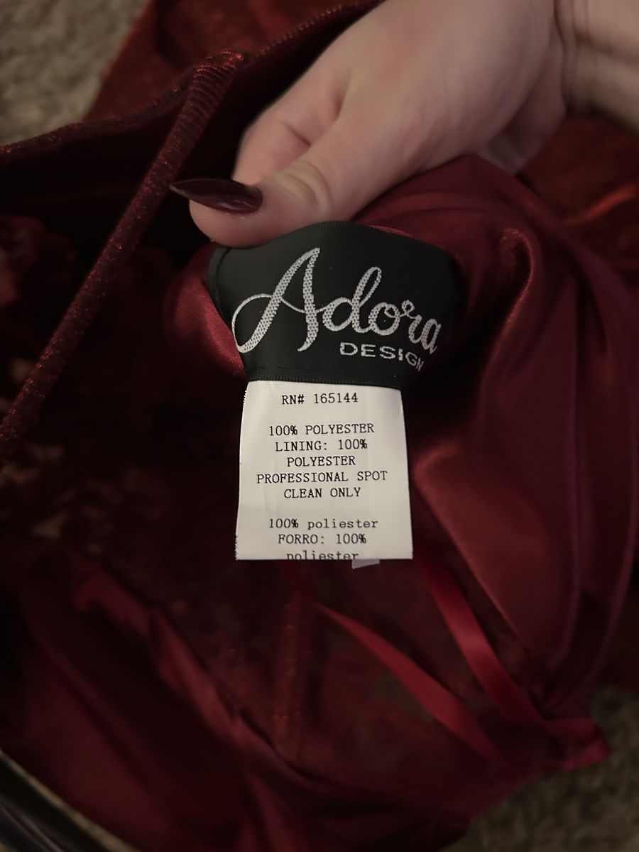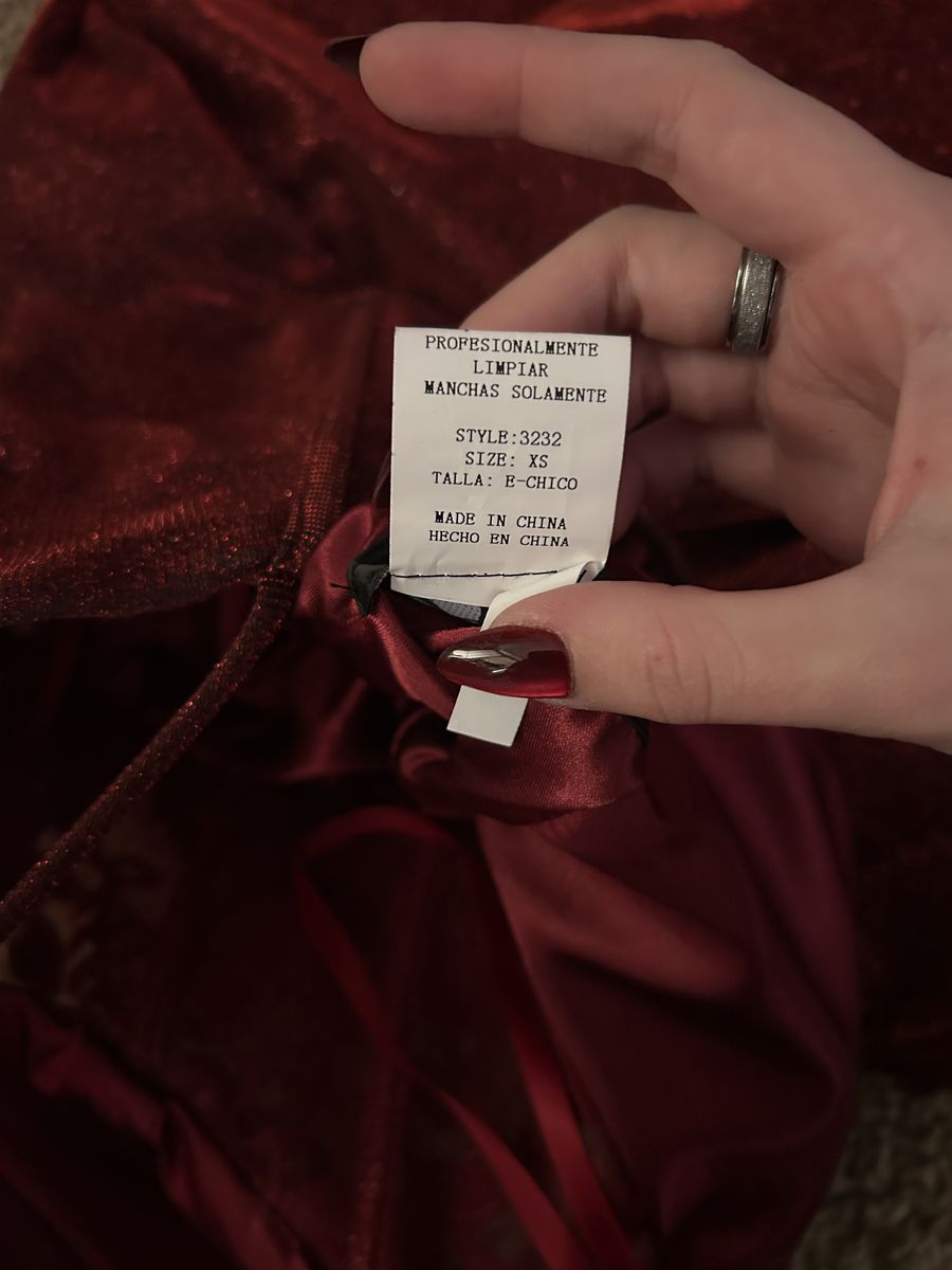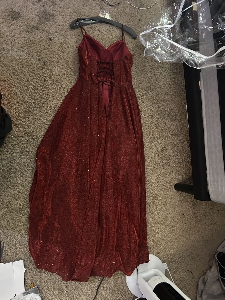Dark red sparkly prom dress, flower details on bodice. Floor length with flowing skirt. Size XS but fits like a small or medium. Worn once, in very good condition.