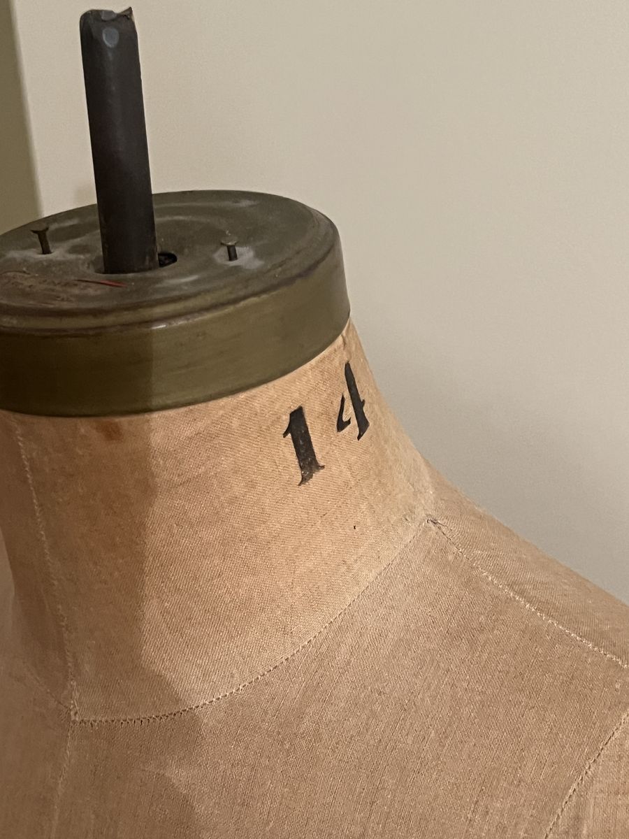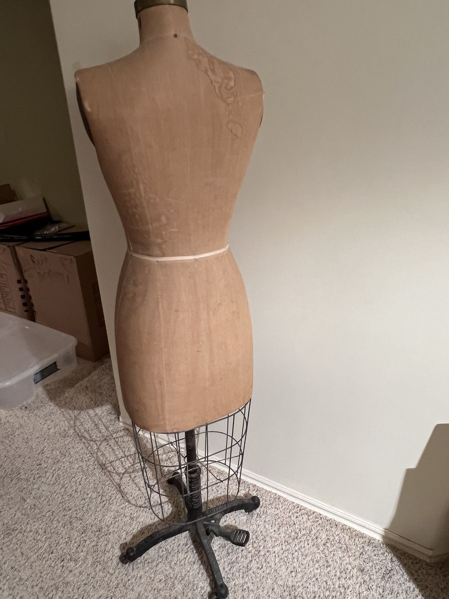 VenmoThis is a vintage dress form, likely a Model 1949 or similar era made by the Wolf Form Company. It features a natural body shape covered in fabric, collapsible shoulders for easy garment removal, and a metal cage skirt extension. The form stands on a heavy-duty cast-iron base with wheels for mobility. I think it’s an old-fashioned size 14. The base has a pedal but it doesn’t seem to work. It’s got a water spot on the shoulder shown in the photos but otherwise sturdy and good condition. Rolls well. It’s 60 inches tall and 14 wide. Pick up in Herriman. Pet and smoke free home. Cash or Venmo. $500. listed for a client