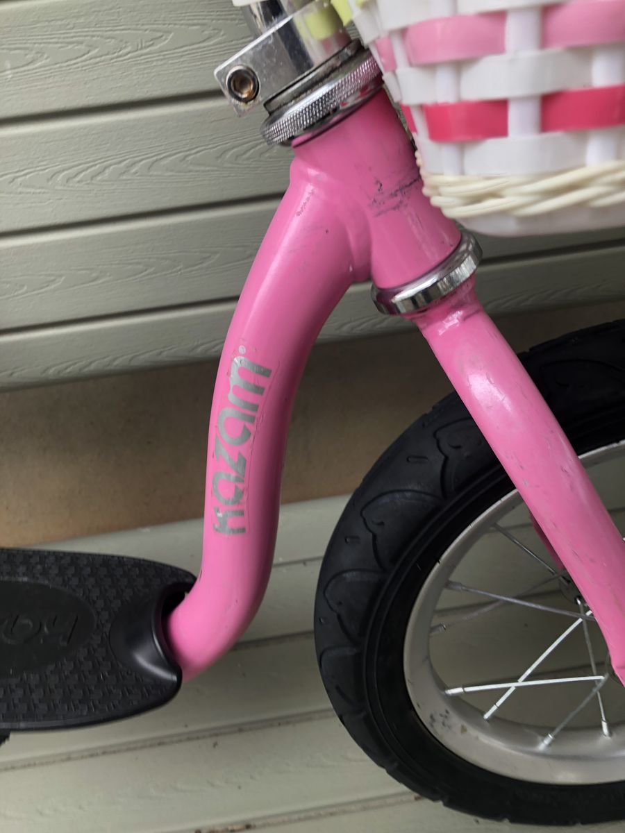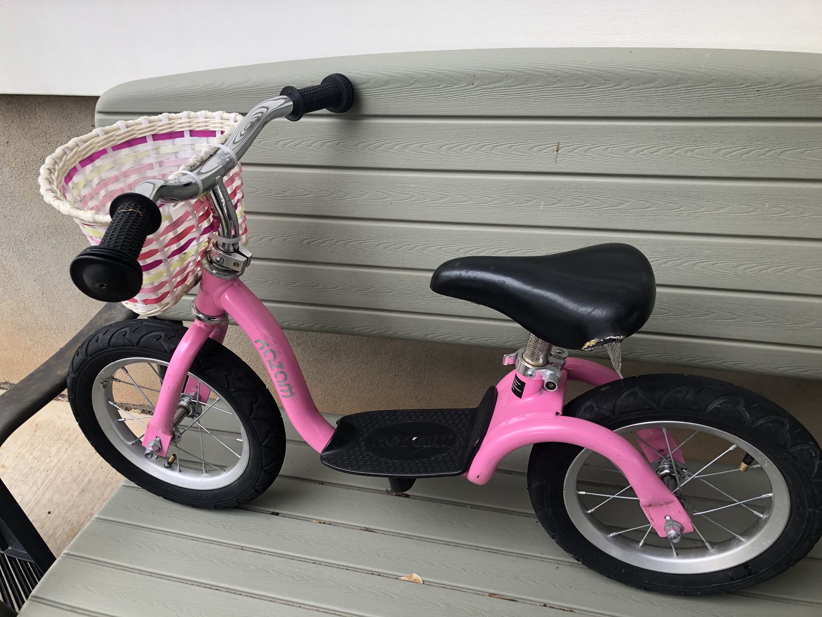 This is a good stepping stone for a real pedal bike. It has pneumatic tires so there’s the real feel of bigger bikes. It’s in good overall condition, the bumps and bruises commonly found on trainers.