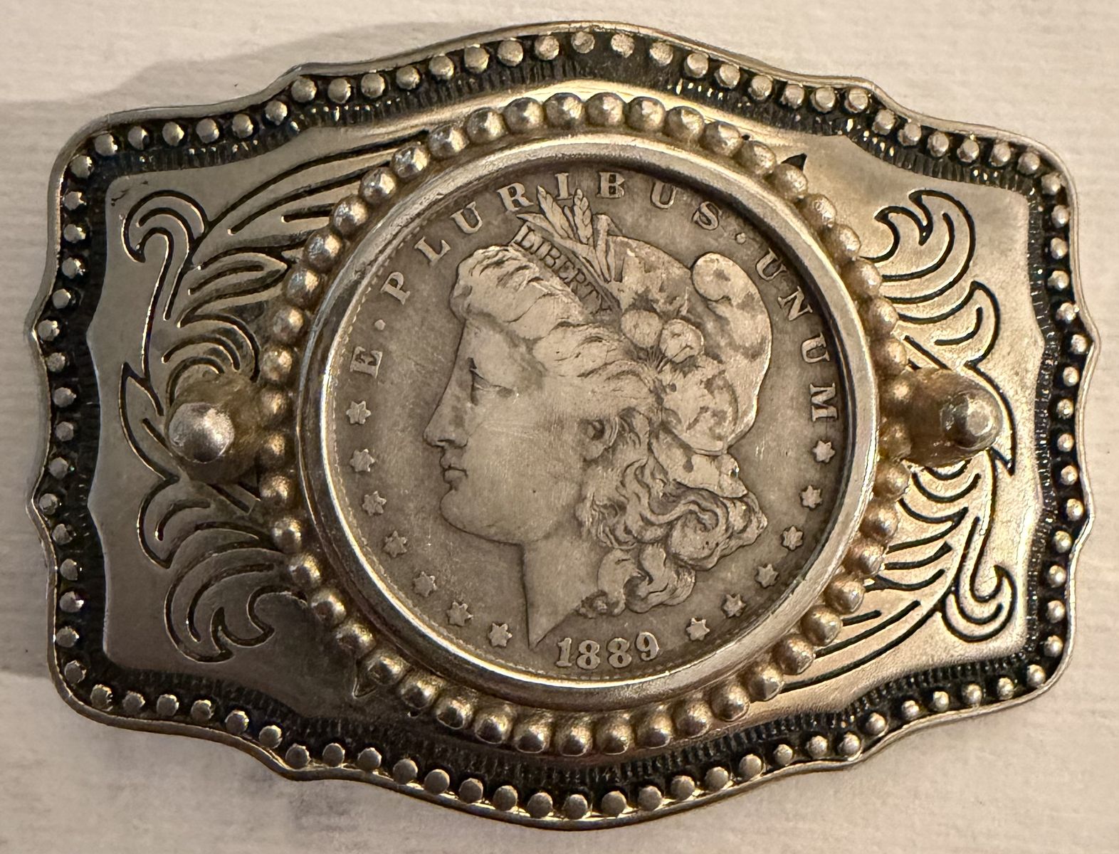 PayPalThis belt buckle is a very collectible piece. It looks to have a vintage Morgan silver dollar from 1889. If you’re a collector or investor in precious metals this is one to have. It weighs 118.47 grams.