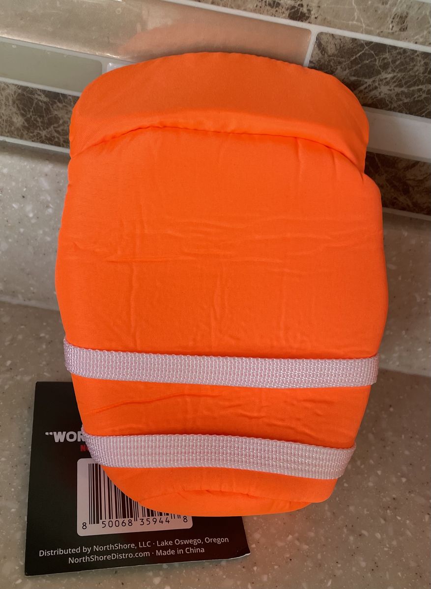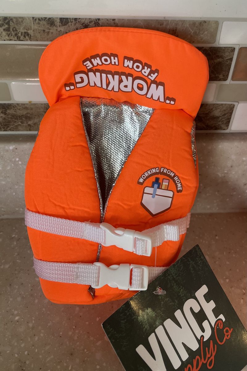VenmoPuffin Cooler insulated beverage life vest, designed to look like a miniature life jacket for drinks. Purpose: Insulates 12 oz cans and bottles to keep them cold and your hands dry. Features: Includes two layers of thermal insulation and functional straps. Functionality: It is designed to float, helping to prevent losing drinks in water.
