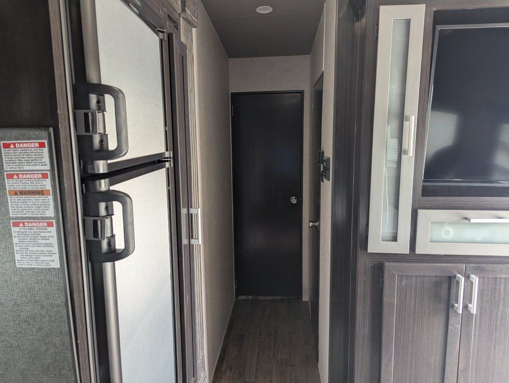 Interior & Comfort Massive Cargo/Kitchen: Tons of counter space and ample overhead cabinetry. Fits a Can-Am X3 Max! Sleeping for 7-8: Master Queen, (2) electric Queen bunks in the rear, and a fold-out twin couch Upgraded Finishes: Stainless steel appliances, upgraded bathroom vanity, and a rear screen wall for the ramp door Entertainment: 50" TV with an upgraded Kicker 3-zone radio (Living, Bedroom, and Exterior speakers)