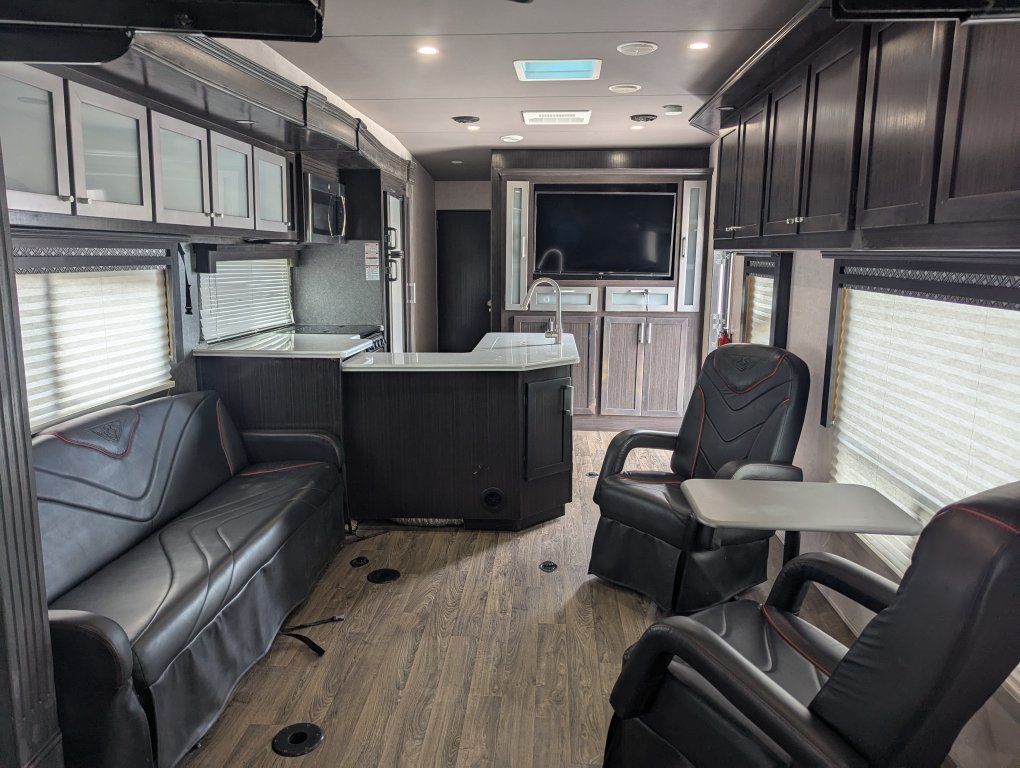 Exterior & Extras Night Visibility: Full LED underglow and spotlights on the rear, passenger, and driver sides Included: All four tables and two captains chairs (couch table and the bottom bunk/bench table not pictured)