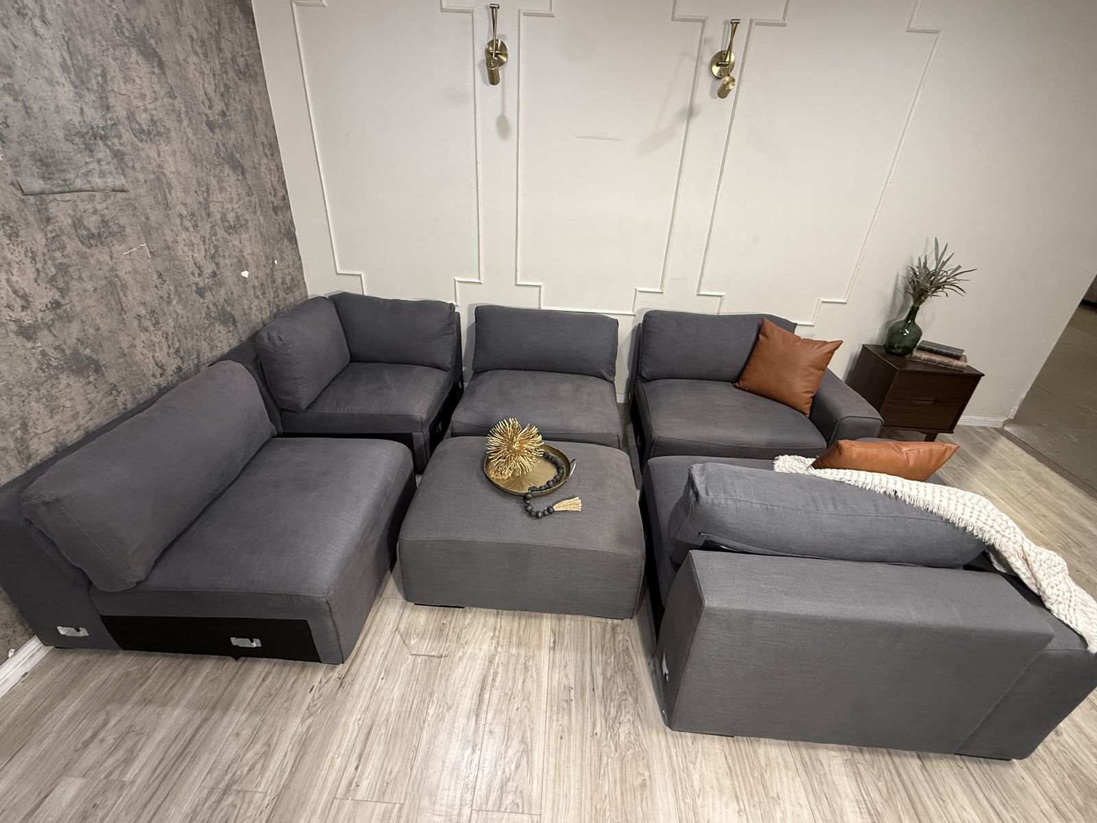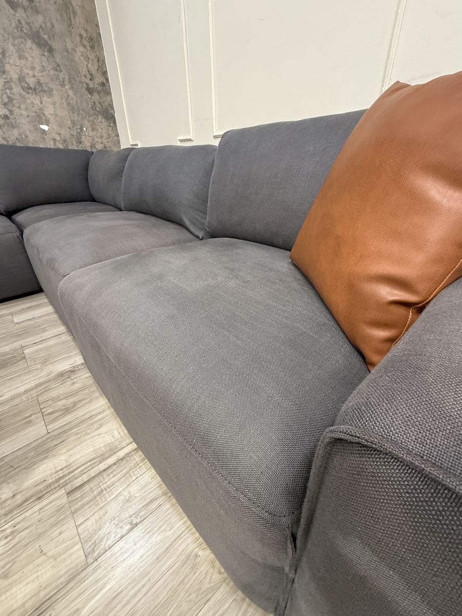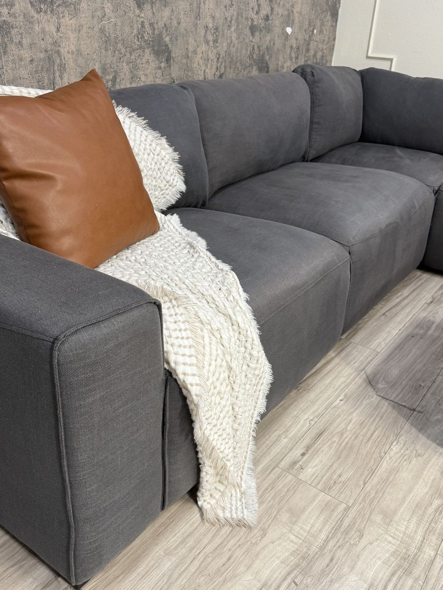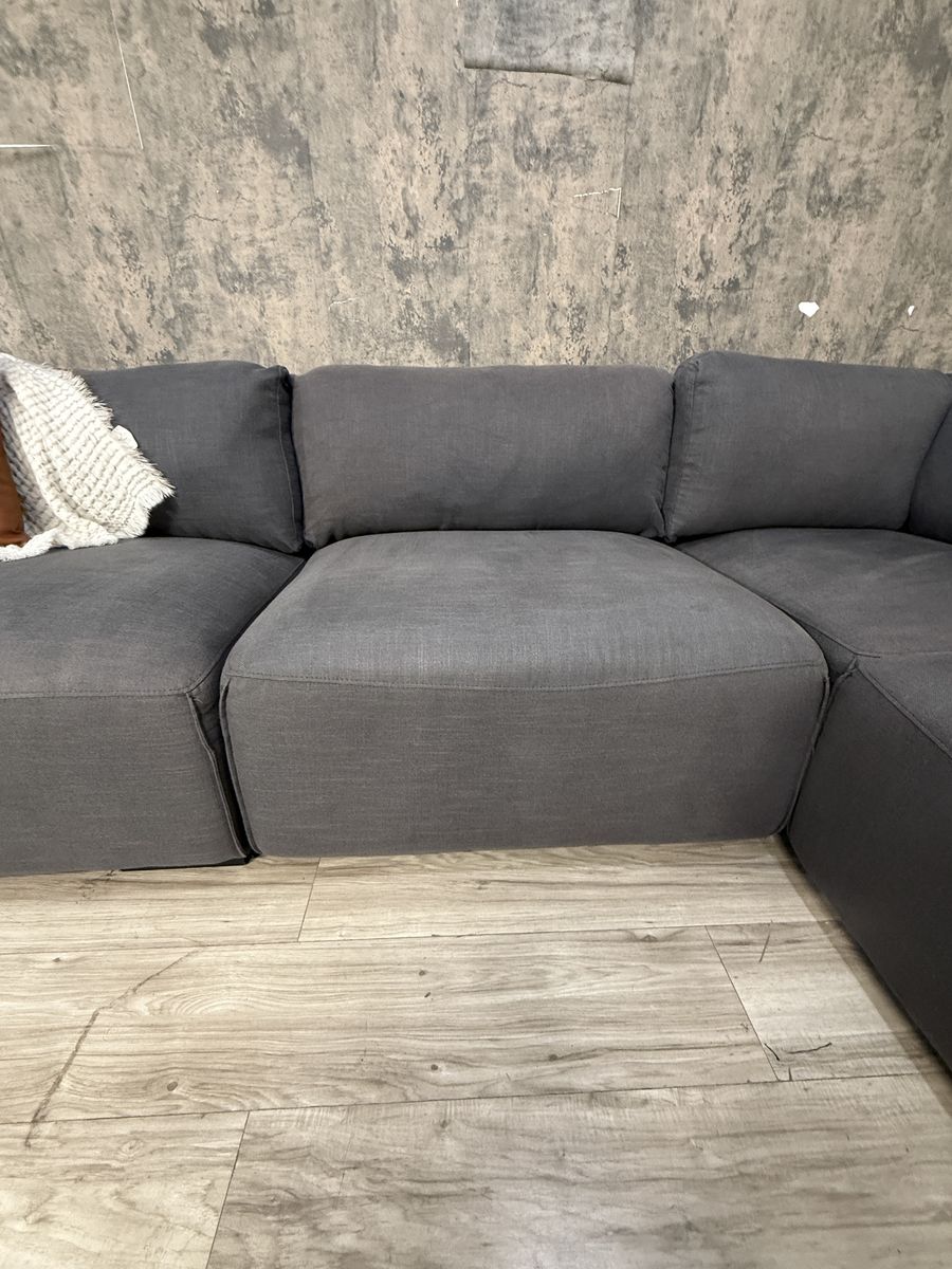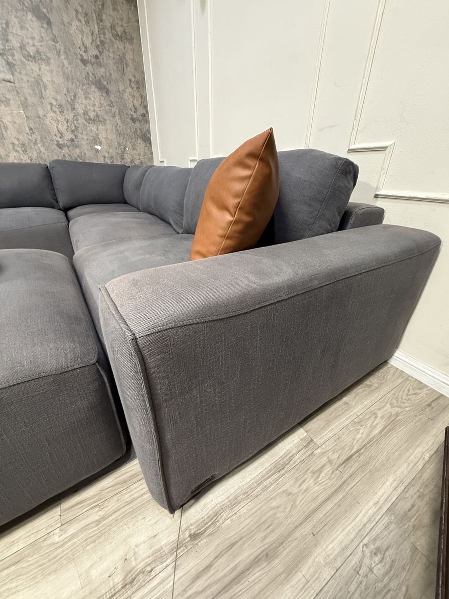 This is a fabulous ABBYSON modular sectional. Color is charcoal grey, material is fabric. Has a linen feel to it. All pieces hook together but it can be reconfigured as desired. You can even make a fun bed for movies and lounging. Back rest cushions are removable and washable.
