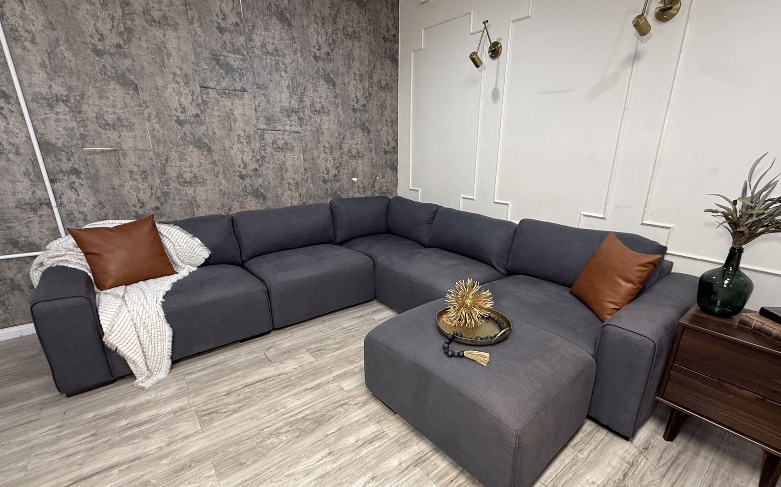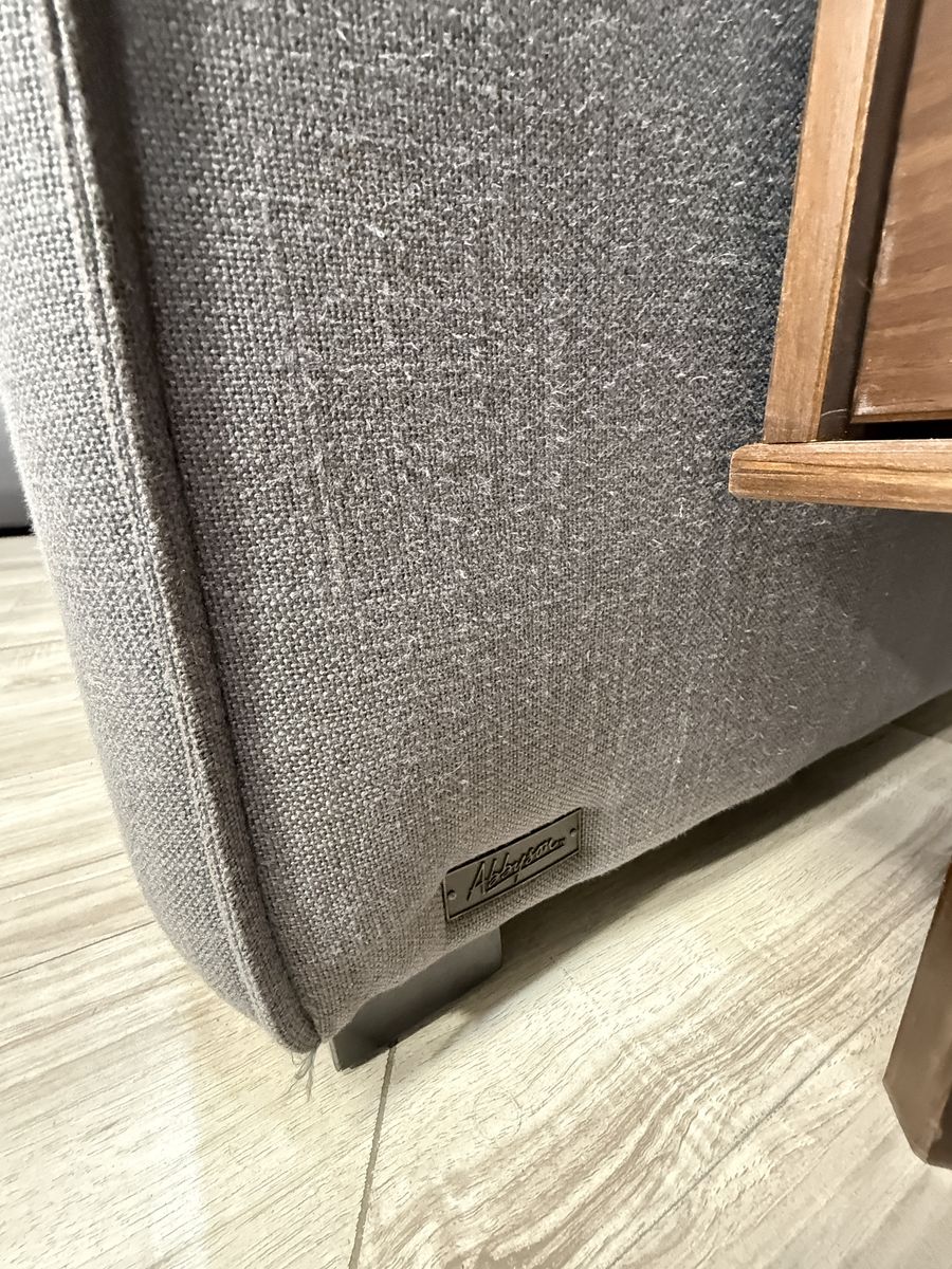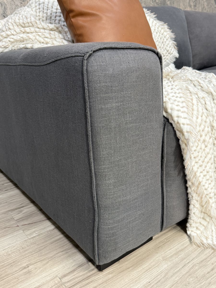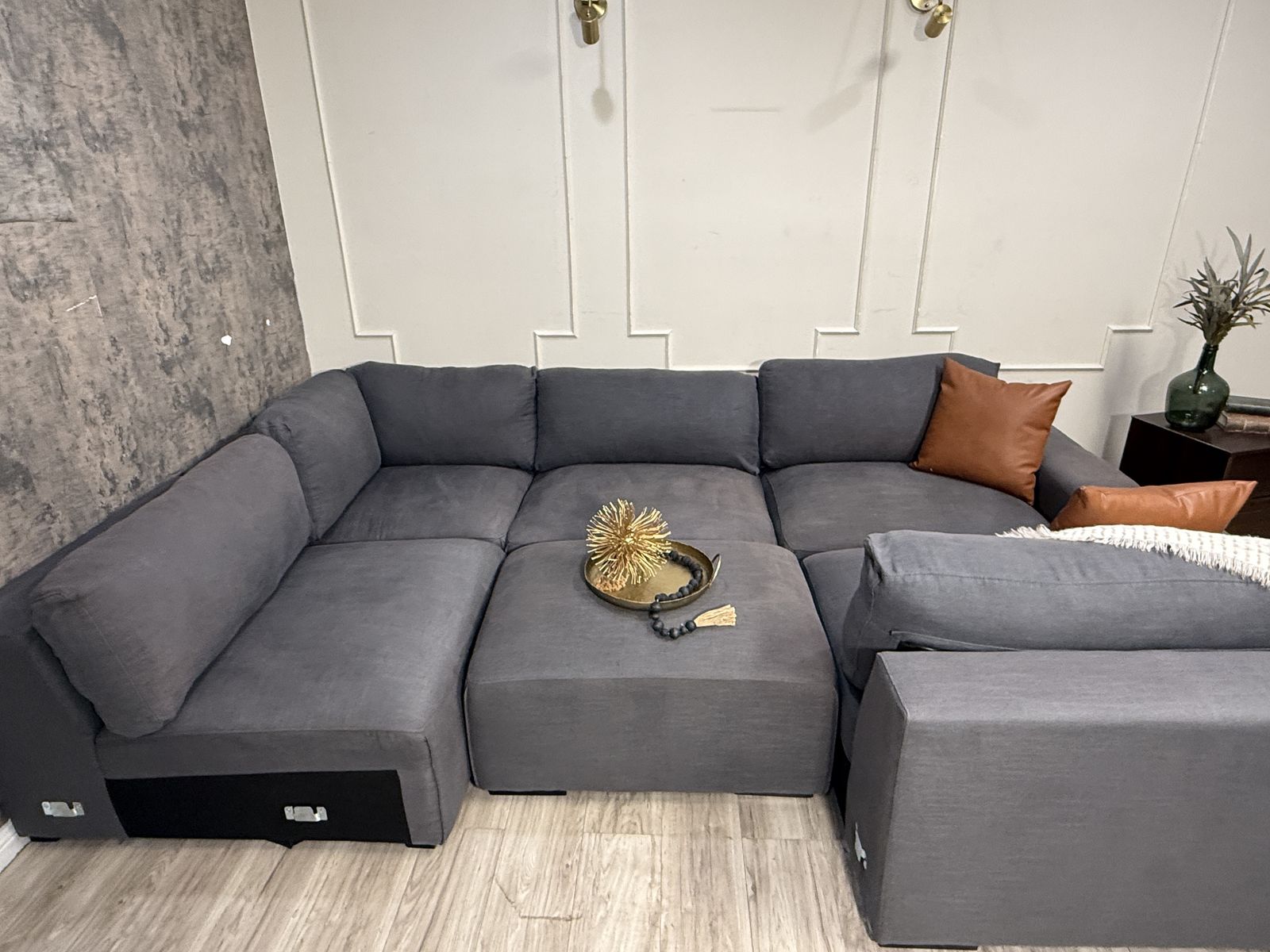 This is a fabulous ABBYSON modular sectional. Color is charcoal grey, material is fabric. Has a linen feel to it. All pieces hook together but it can be reconfigured as desired. You can even make a fun bed for movies and lounging. Back rest cushions are removable and washable.