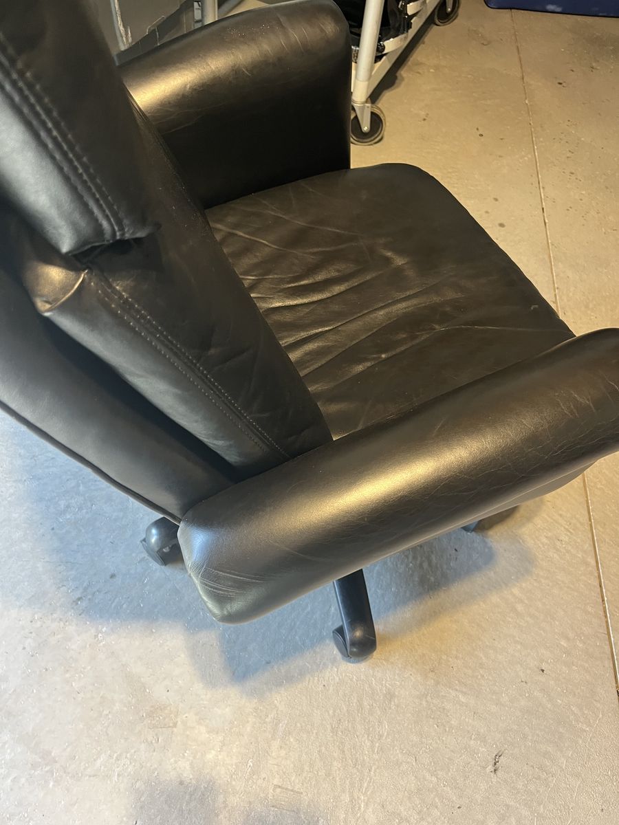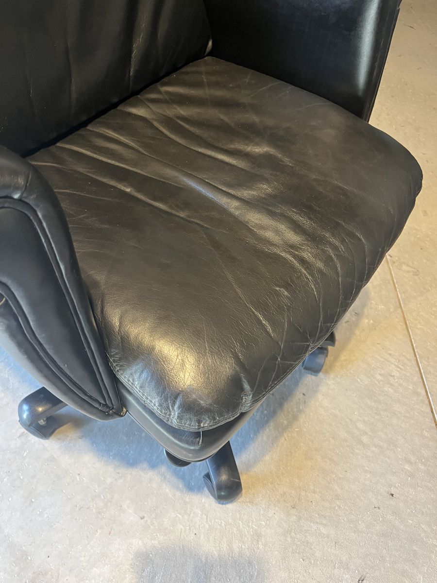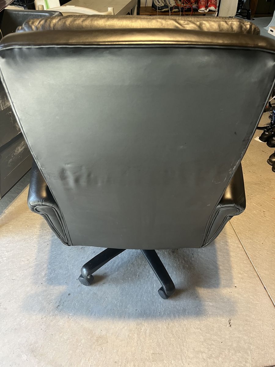 St Thomas black adjustable office chair, locks in place or rocks back, goes up and down, no rips or tears, comfortable, soft padding. 20 1/2 inches wide 18 inches deep, the back is 27 inches tall. Located in Saratoga springs