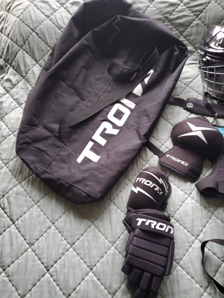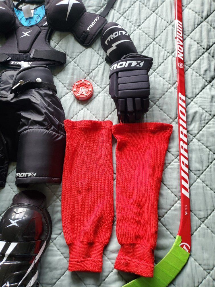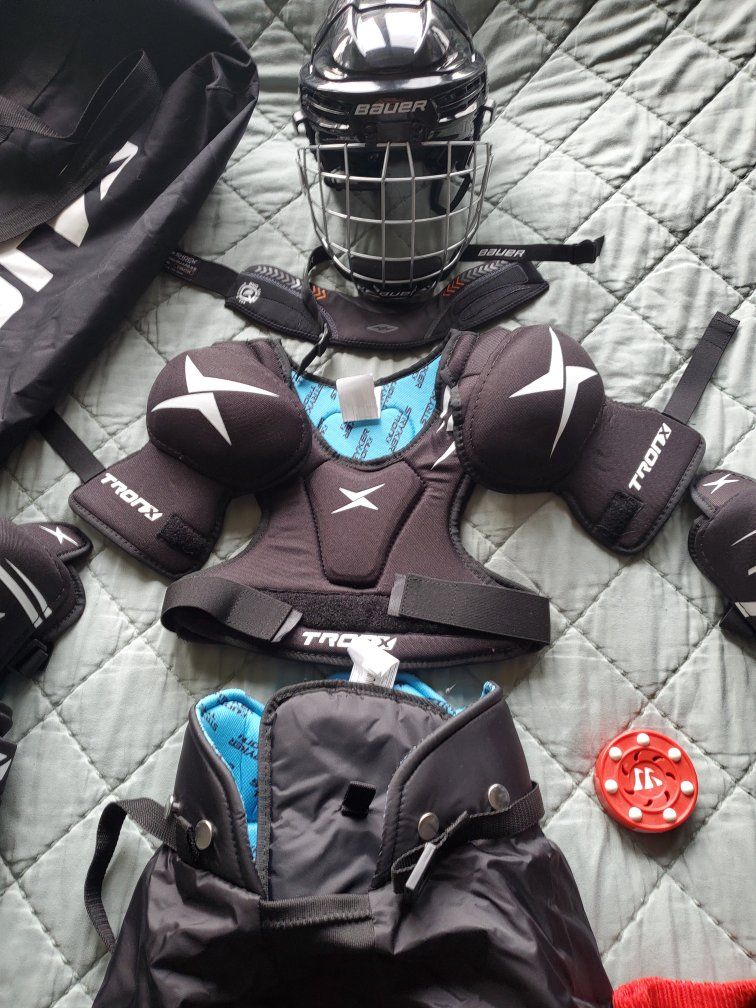 Ton X youth/junior hockey starter kit. Bauer helmet Tron X youth/junior shoulder pads Tron X youth/junior elbow pads Tron X youth/junior gloves Tron X youth/junior gridle Tron X youth/junior shin pads shin pad socks Lowry Sport shorts with cup Warrior Novium SP stick W03-30flex-yth All together $200.00 or best offer Thank you for your time.