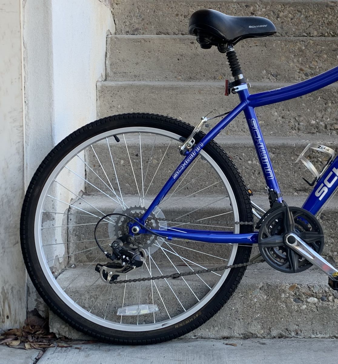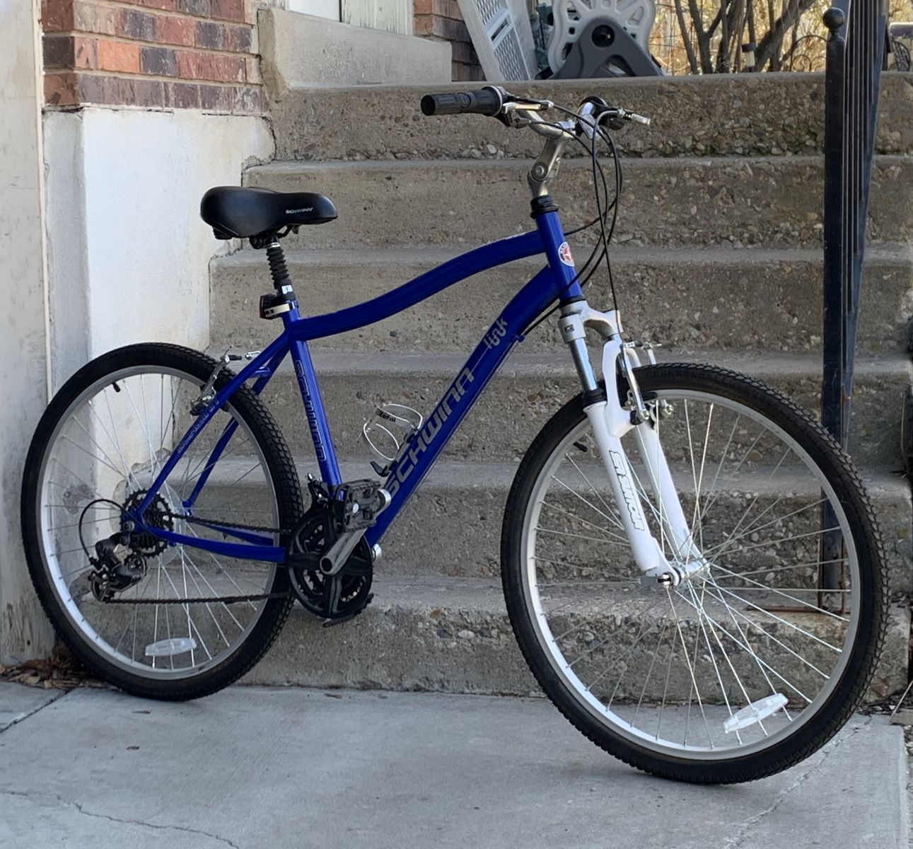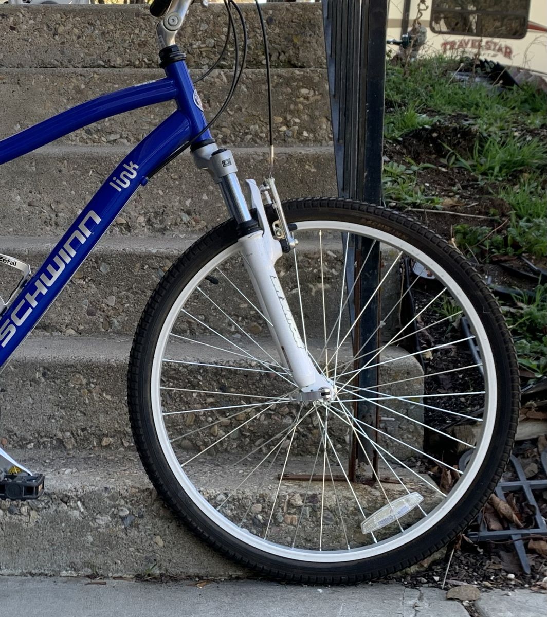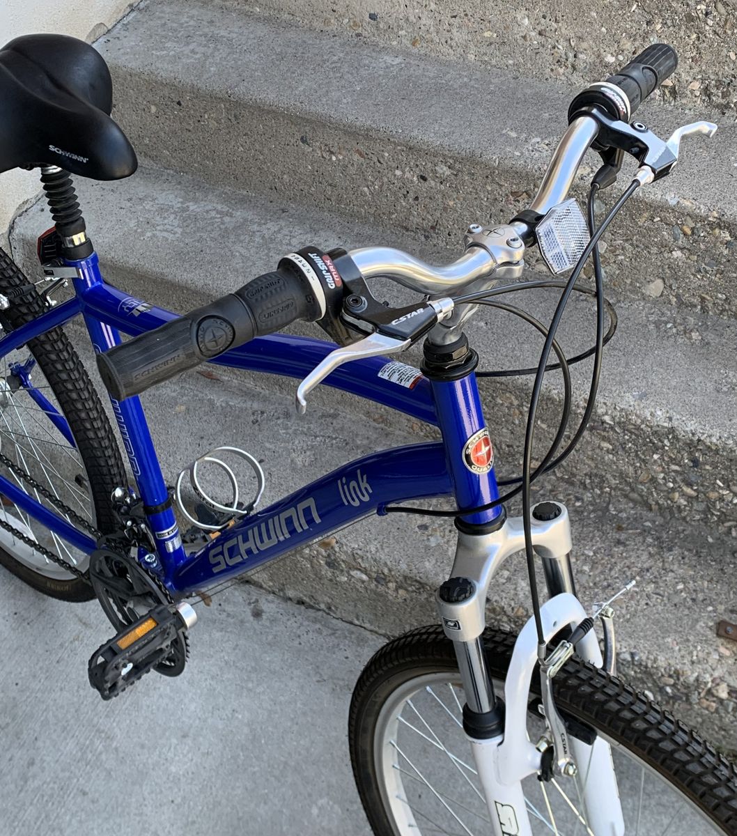 ZelleSchwinn City Link Hybrid Bike 21spd Shimano gears Shimano twist shifters 18” med. aluminum frame Front suspension QR aluminum wheels QR adjustable seat Waterbottle holder Kickstand All-terrain 26” x 1.75” tires