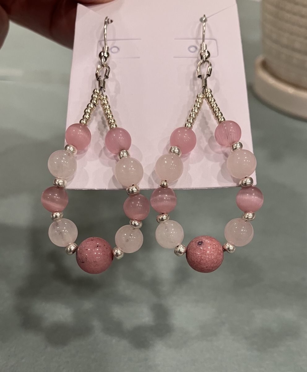 VenmoHandmade, teardrop earrings made with rose quartz and rhodonite gemstones and silver colored accent beads. Earrings are 2 inches long and earwires are silver plated. Gift box included. Local meetup or can mail with ship fee.