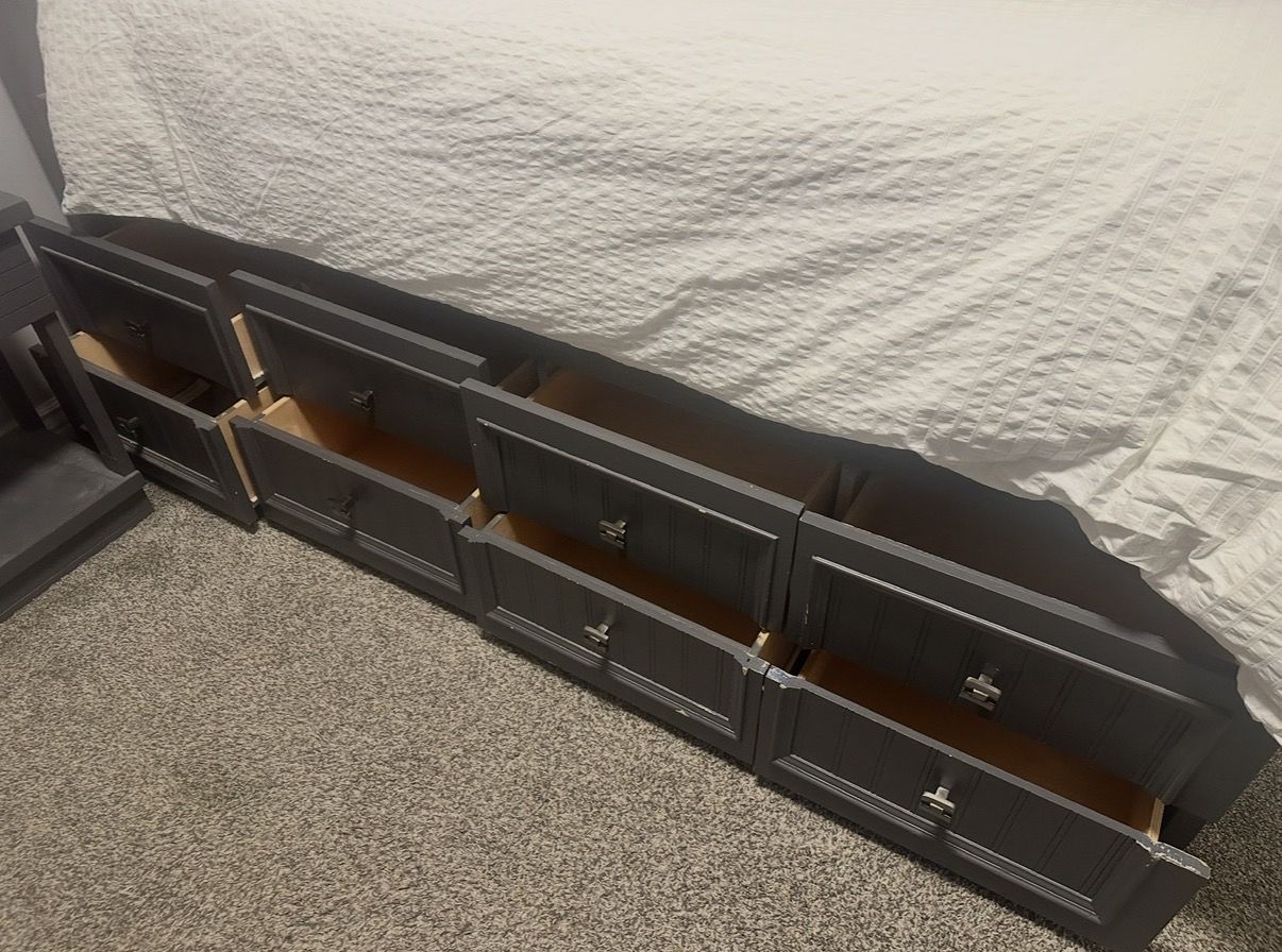 Bed has eight drawers for tons of storage. We never needed to purchase additional drawers for our kids’ clothes. Easily paintable to customize to your needs but the current paint job is in decent shape too. Knobs can be easily switched as well.