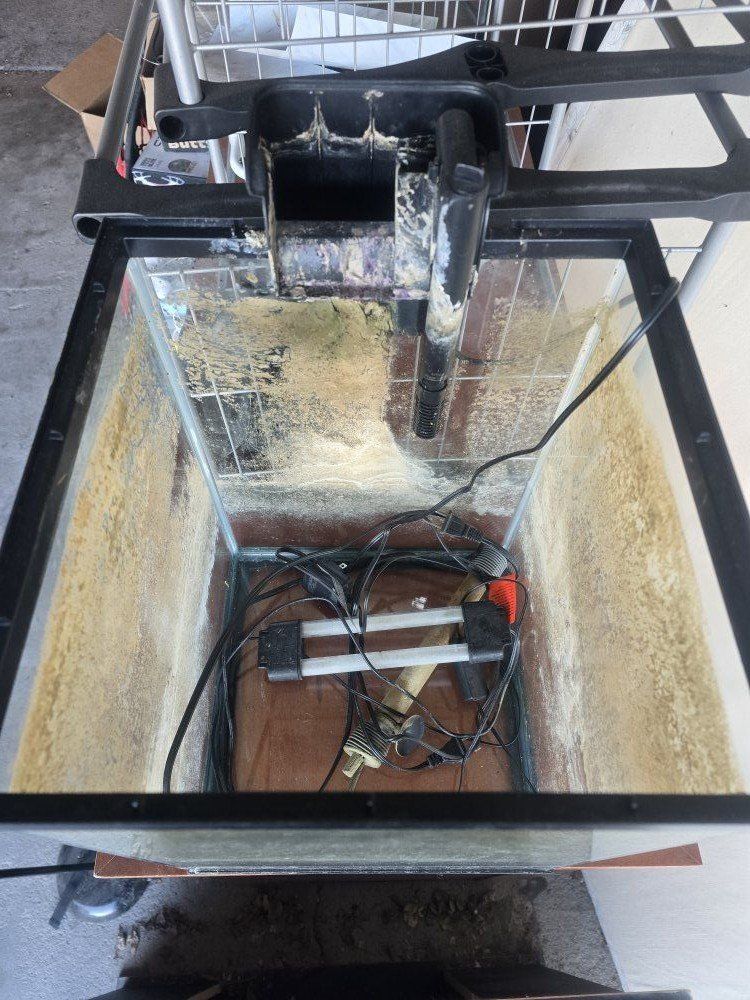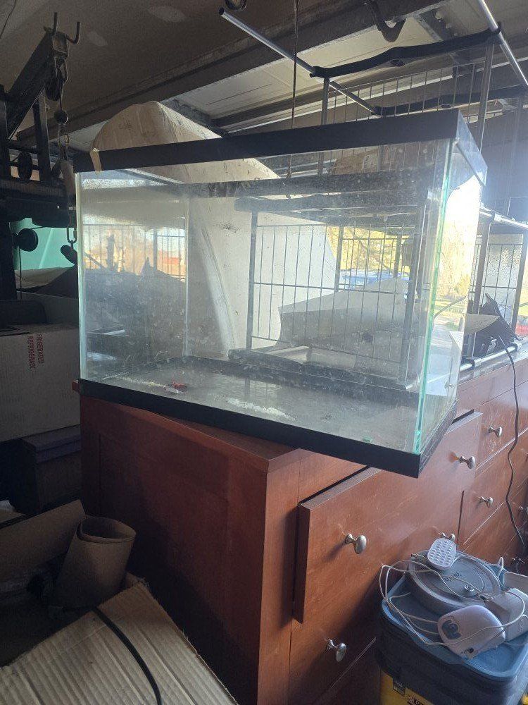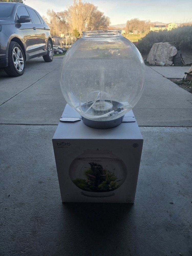 8 gallon globe the light doesn't work anymore, has a built in sponge filter, comes with air pump, 20$