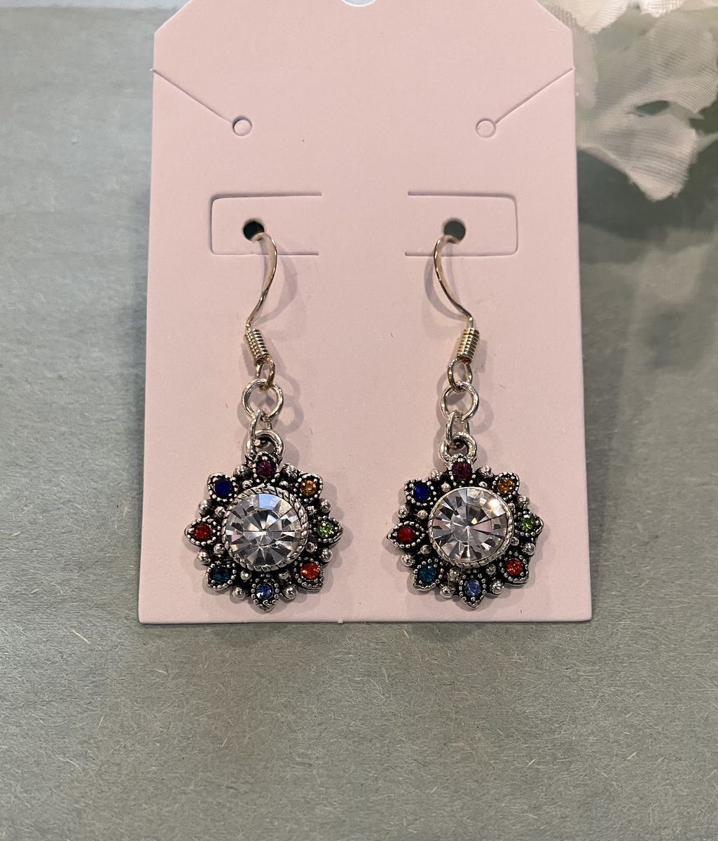 VenmoSilver colored flower charm earrings adorned with central clear rhinestones, & surrounded by smaller multicolored rhinestones. These dainty charm earrings are .5 inches in diameter. Ear wires are silver plated. Gift box included. Local meetup or can mail with ship fee.