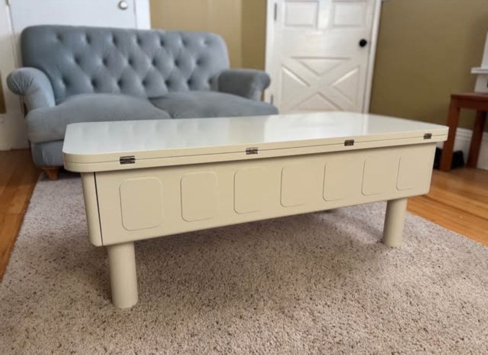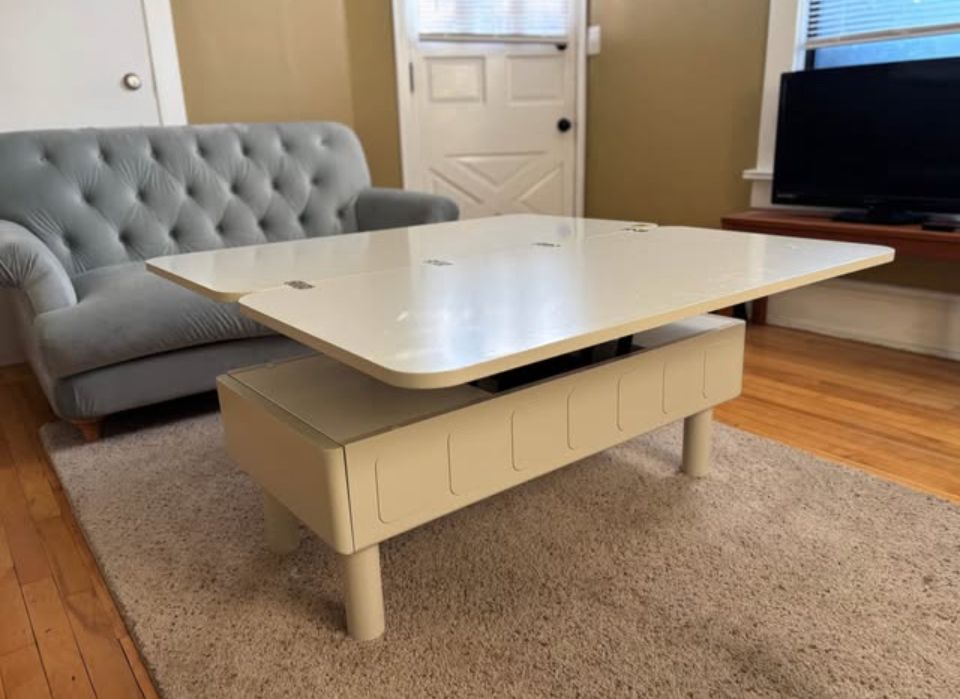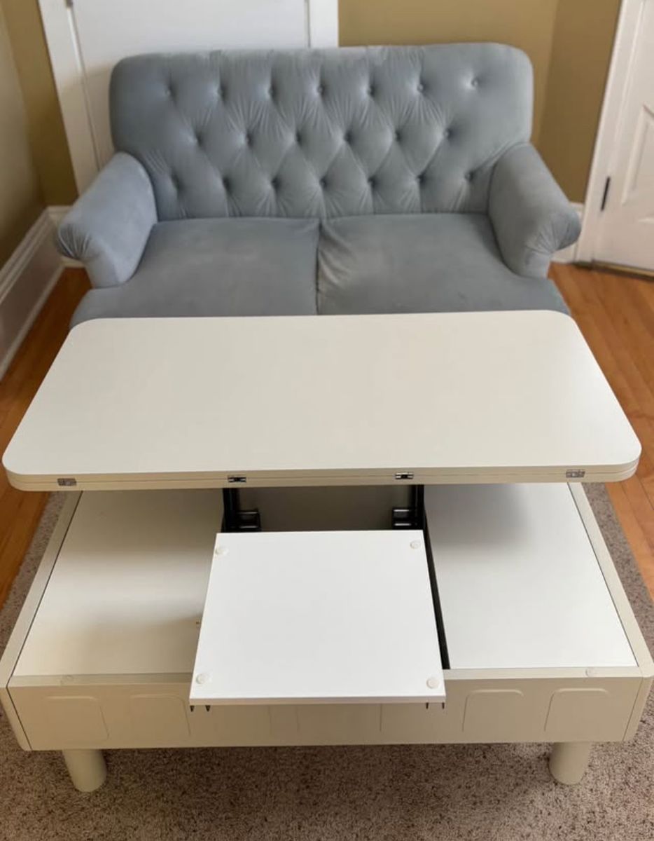 Beautiful and sturdy white laminate pull-up desk that expands into a larger table and retracts into a coffee table! Has a storage inside the center, as well as two side drawers.