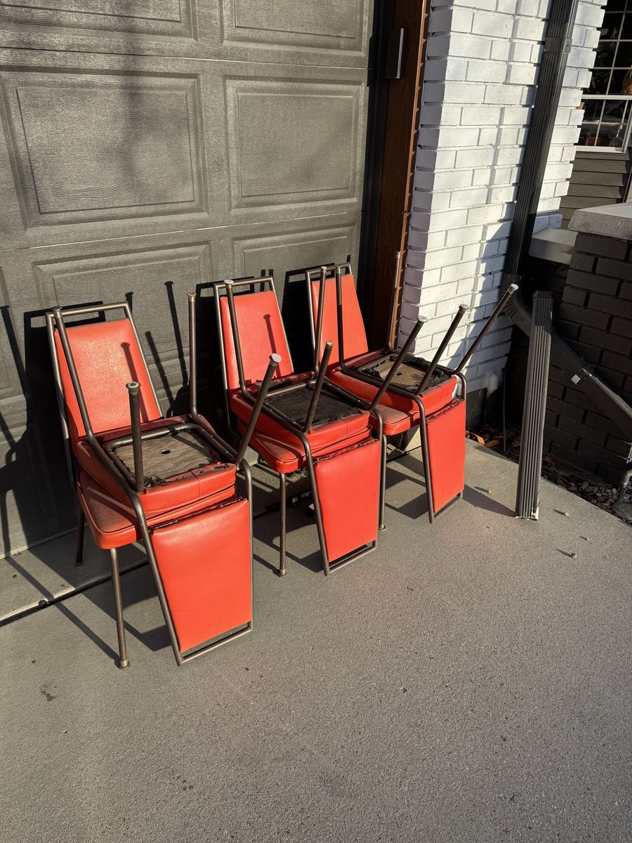 ApplePaySet of six vintage red vinyl diner style chairs with metal frames. Classic retro look. Structurally solid. Some feet are missing. Could be used as is or a fun restoration project.