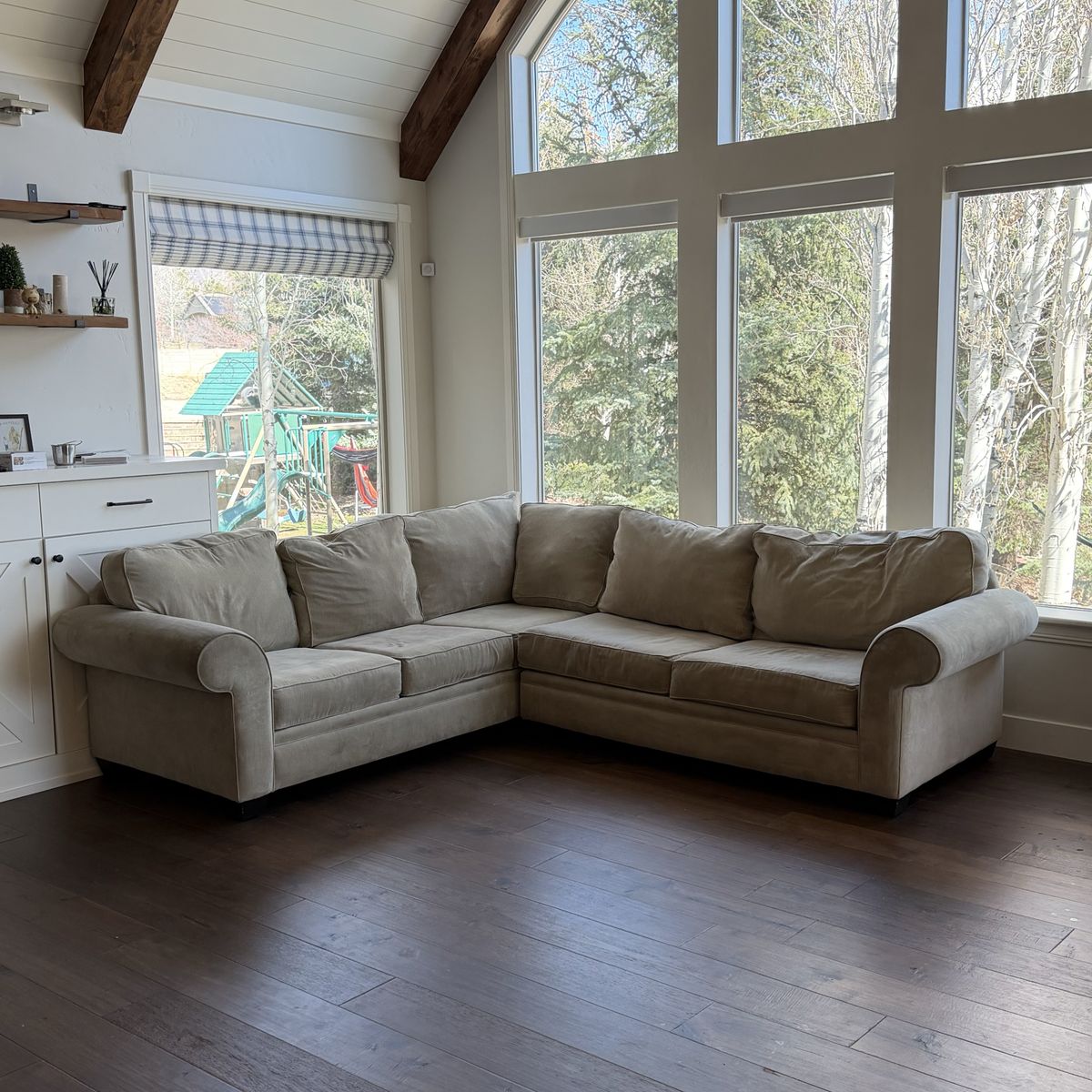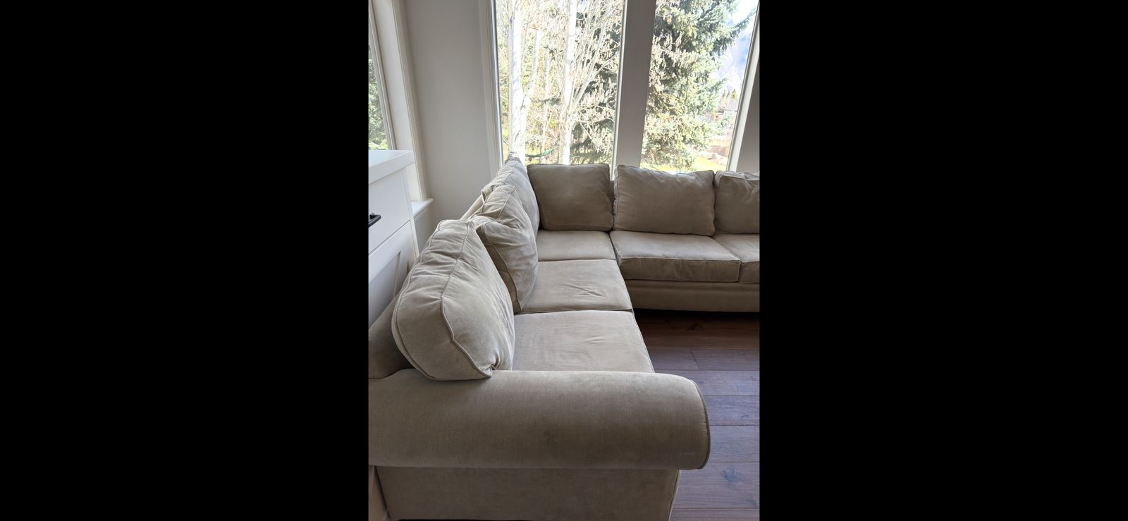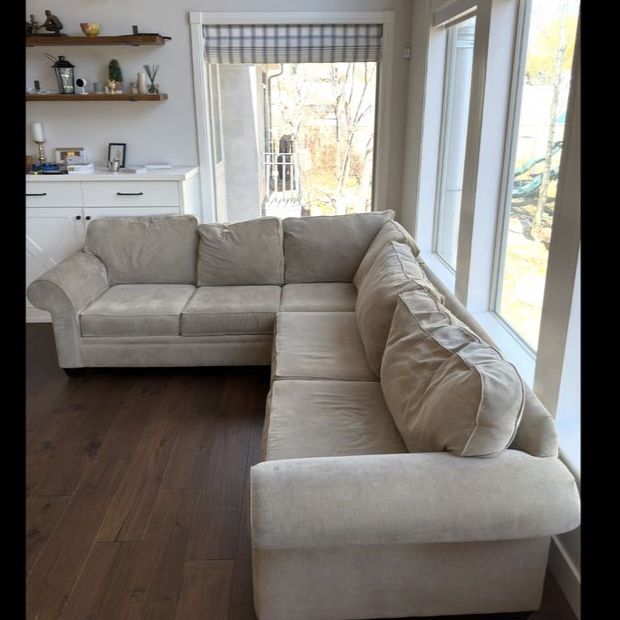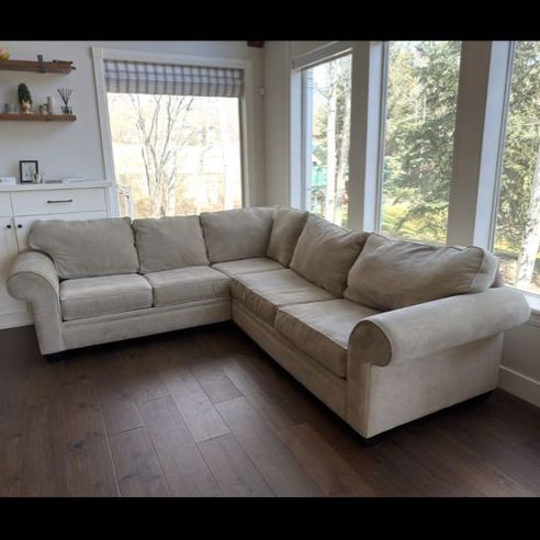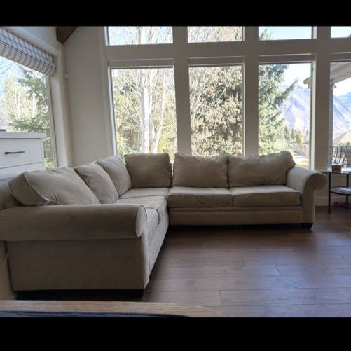 VenmoComfortable L-shaped sectional couch in good condition. Neutral beige fabric that works well with most living rooms. Cushions are supportive and the couch has been kept in a clean, smoke-free home. No major stains or tears.