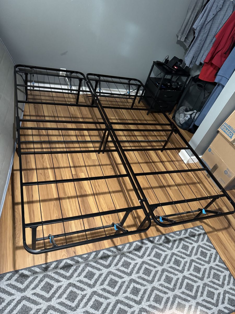 Queen size mattress only used for a few months, comes with metal frame, no odors or stains.