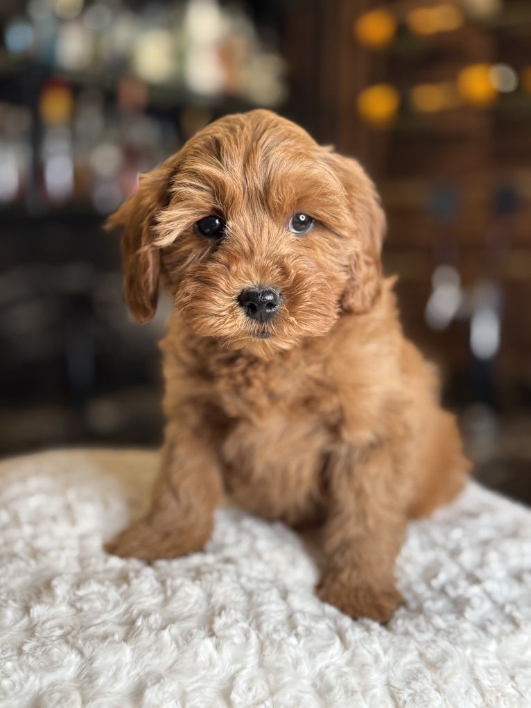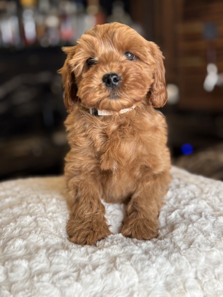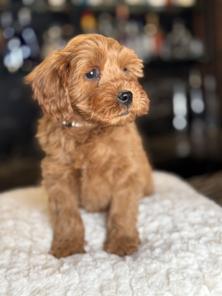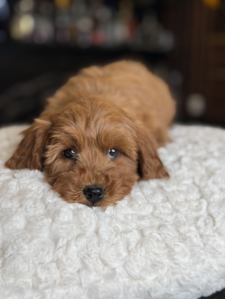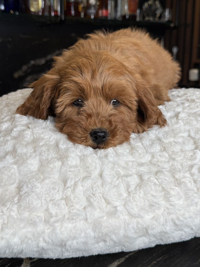 They will not shed at all! Both parents have beautiful temperaments and health tested! One female has the coolest black stripe on her face! It is a black pigment like a birthmark that makes her stand out! She is so unique and beautiful! She will turn heads. In all my years of breeding I’ve never seen a marking like this on a deep red Goldendoodle! They were raised around kids, big dogs and cats and are very socialized and confident. They are doggy door trained to use the bathroom outside. They were dewormed at 2,4,6, and 8 weeks and first and second set of shots given. We have 2 girls and 1 boy left.