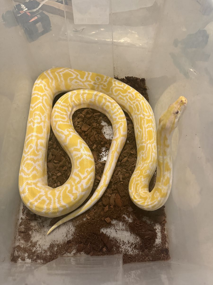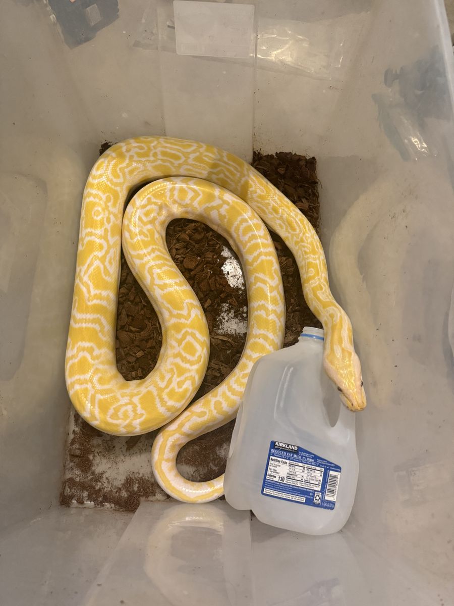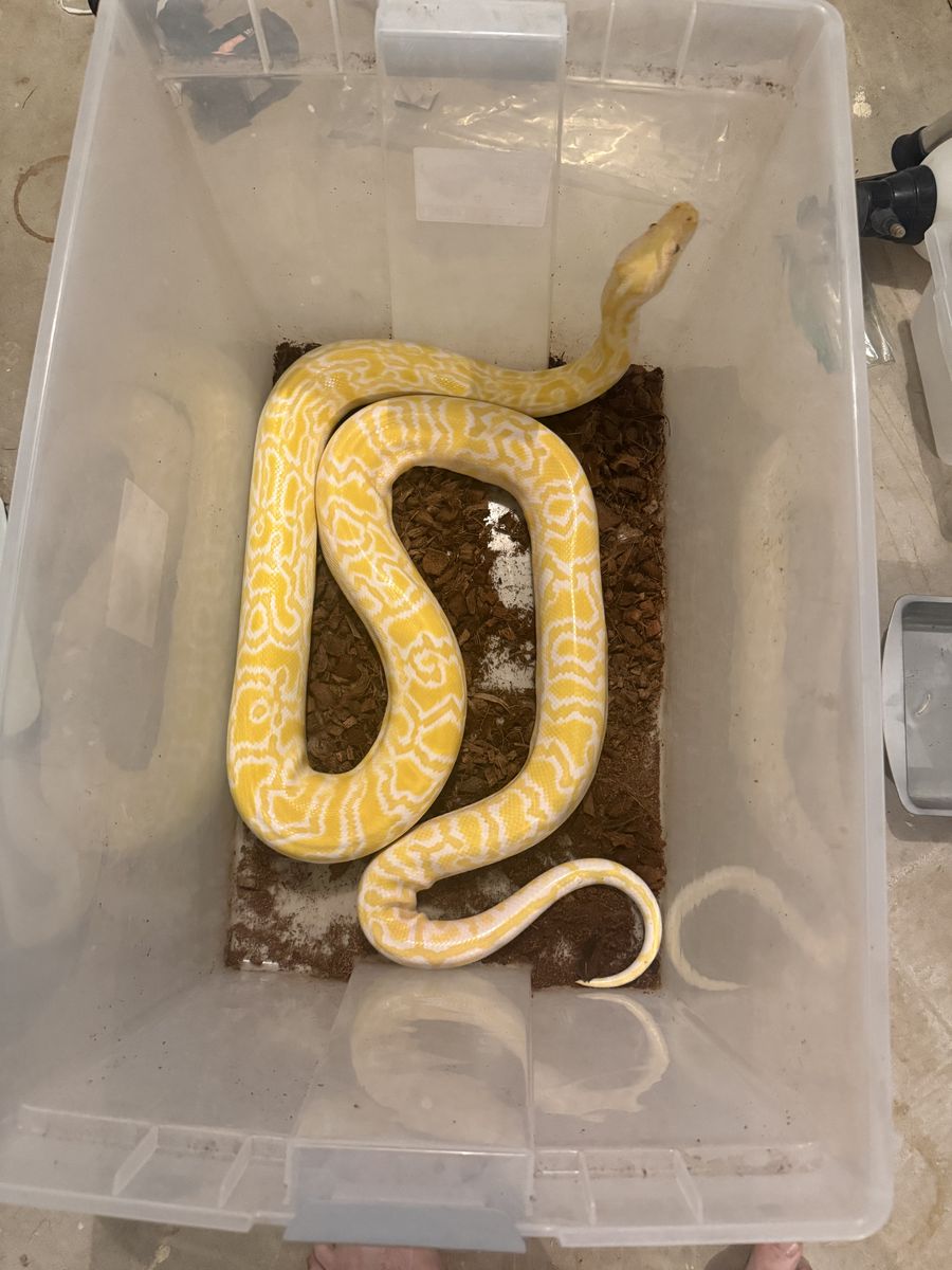 ZelleCurrently sitting about 7-8’ and right at 15 pounds, shouldn’t grow much more if any. This boy has been awesome for us, sired a beautiful clutch of hypo and pearl granites last year. But, we got him as a backup male for our main male until he was up to size, and that time has come. Produced and purchased from Bob Clark, he’s been the same size the 3 years we’ve owned him on a roughly every 4-6week feeding schedule with either a colossal rat or 1lb rabbit, any more than that and he starts getting too fatty. Super great disposition, great breeder. Will be sad to see him go but we’re consolidating our Burm project and need the space for others. Any questions just ask!