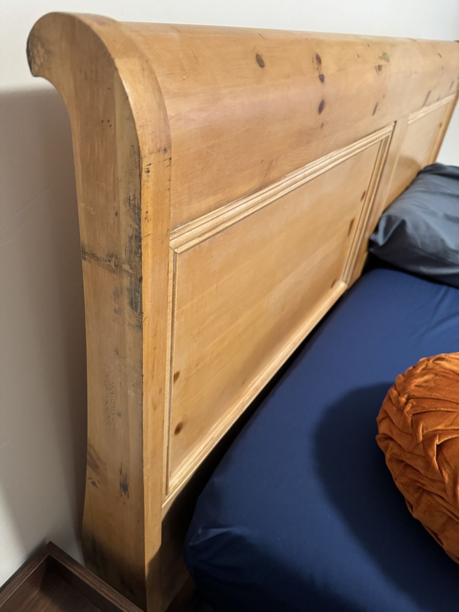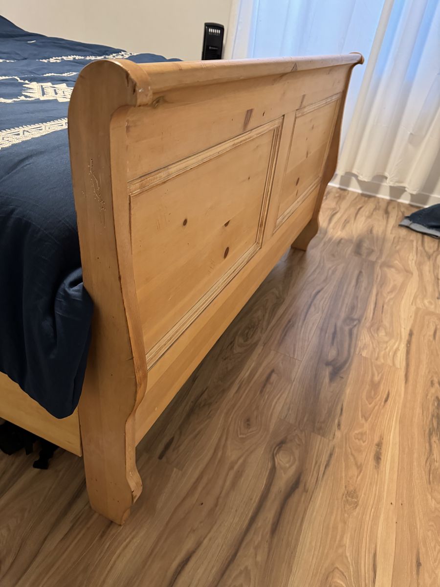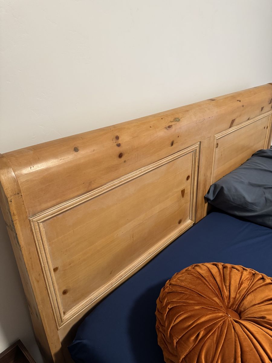 Queen size bed frame, it’s a little beat up but still in good shape! I can send it with the metal box frame if wanted for no extra