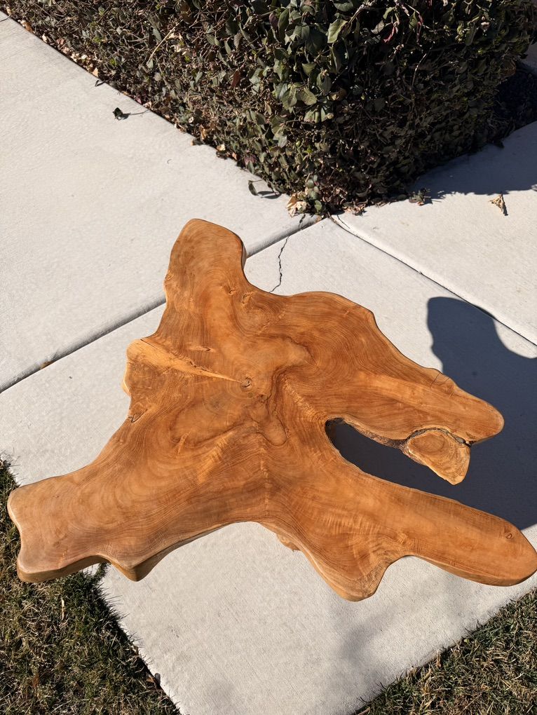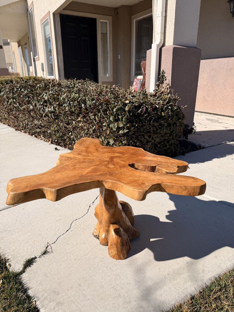This table is a functional piece of art and a perfect addition for anyone who loves rustic, natural, or cabin-style décor, it does have some superficial scratches but nothing major as you can see by the pictures. The widest point is about 32” and is 18” high