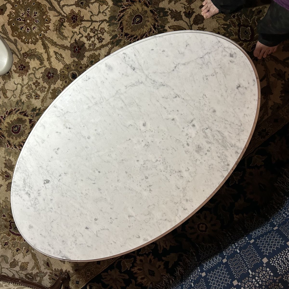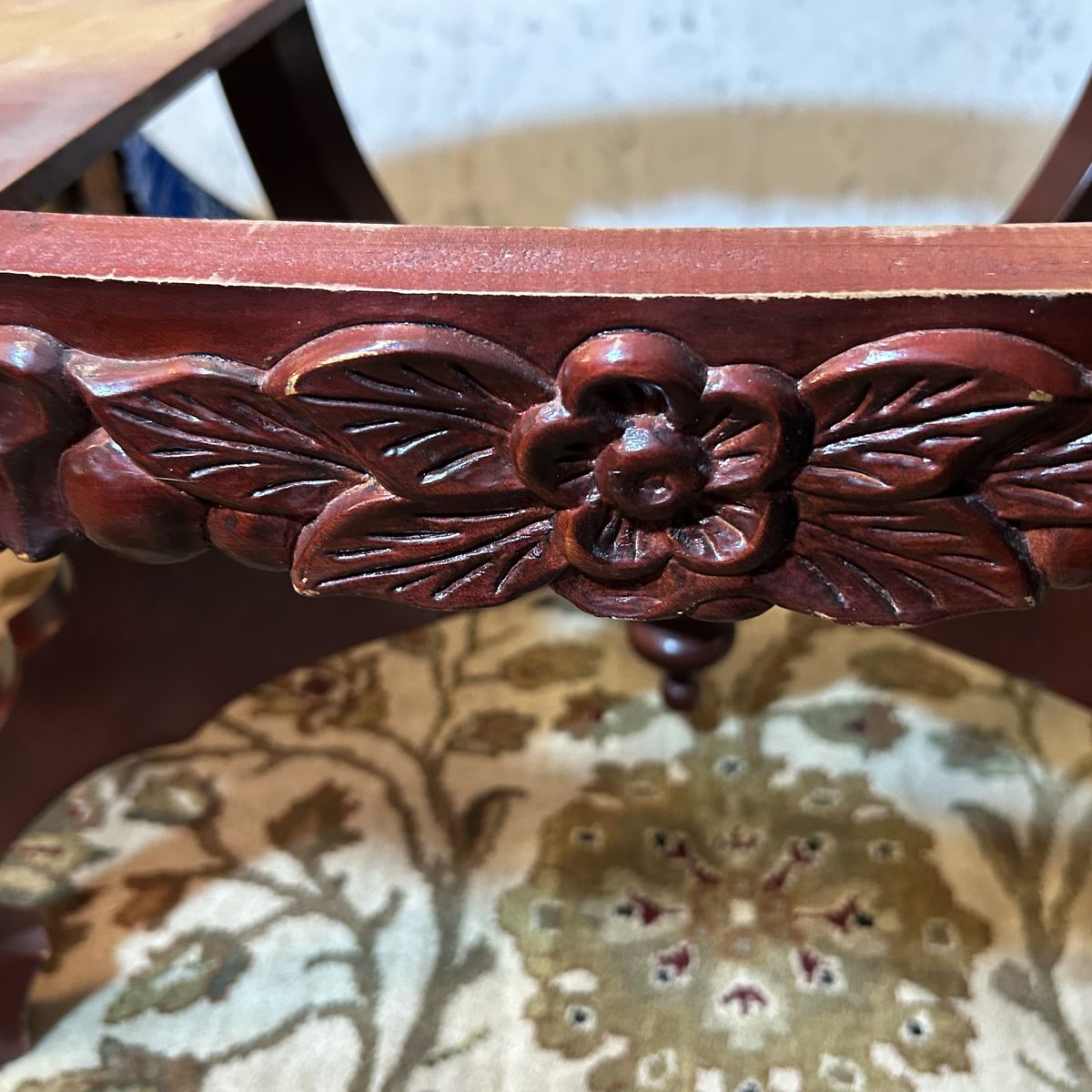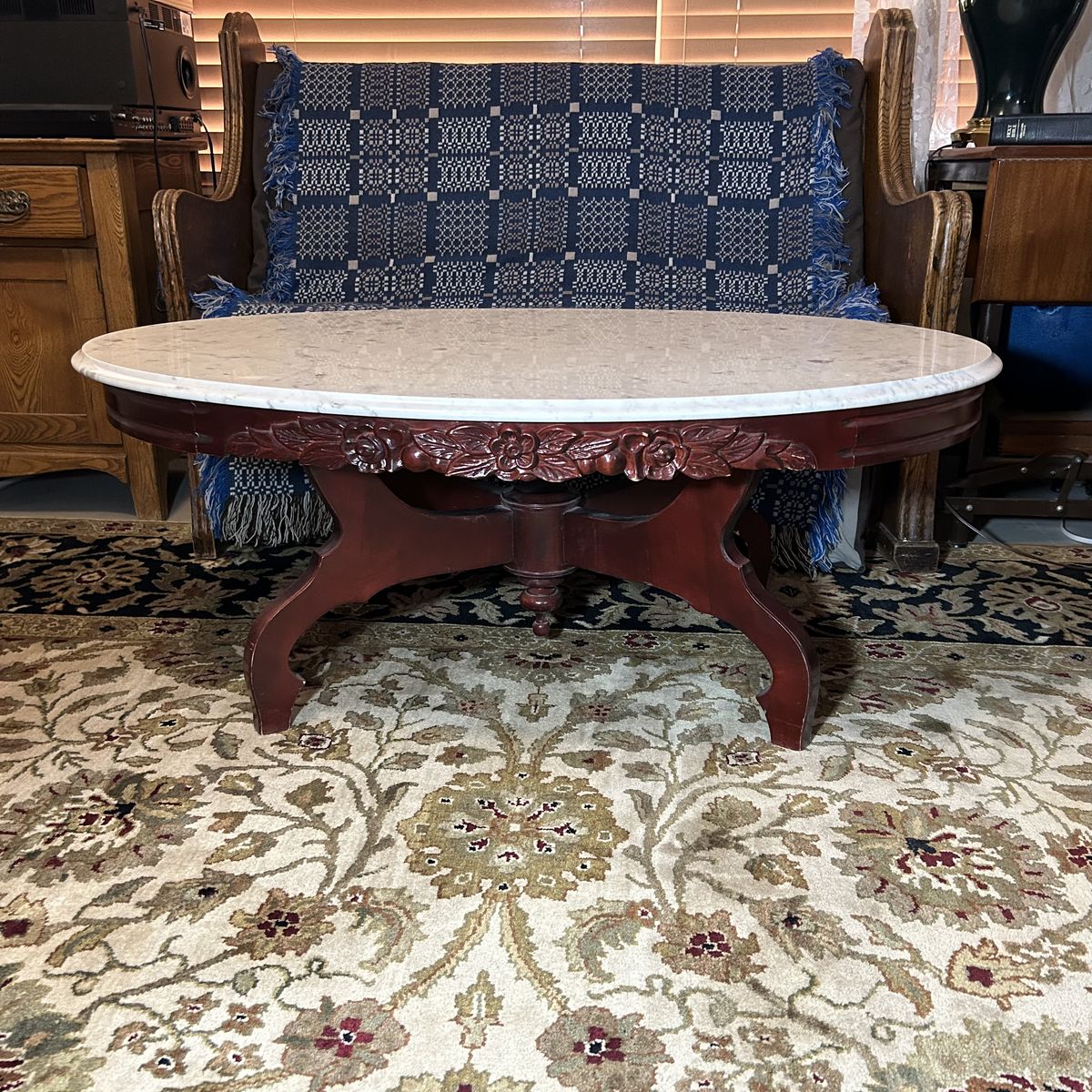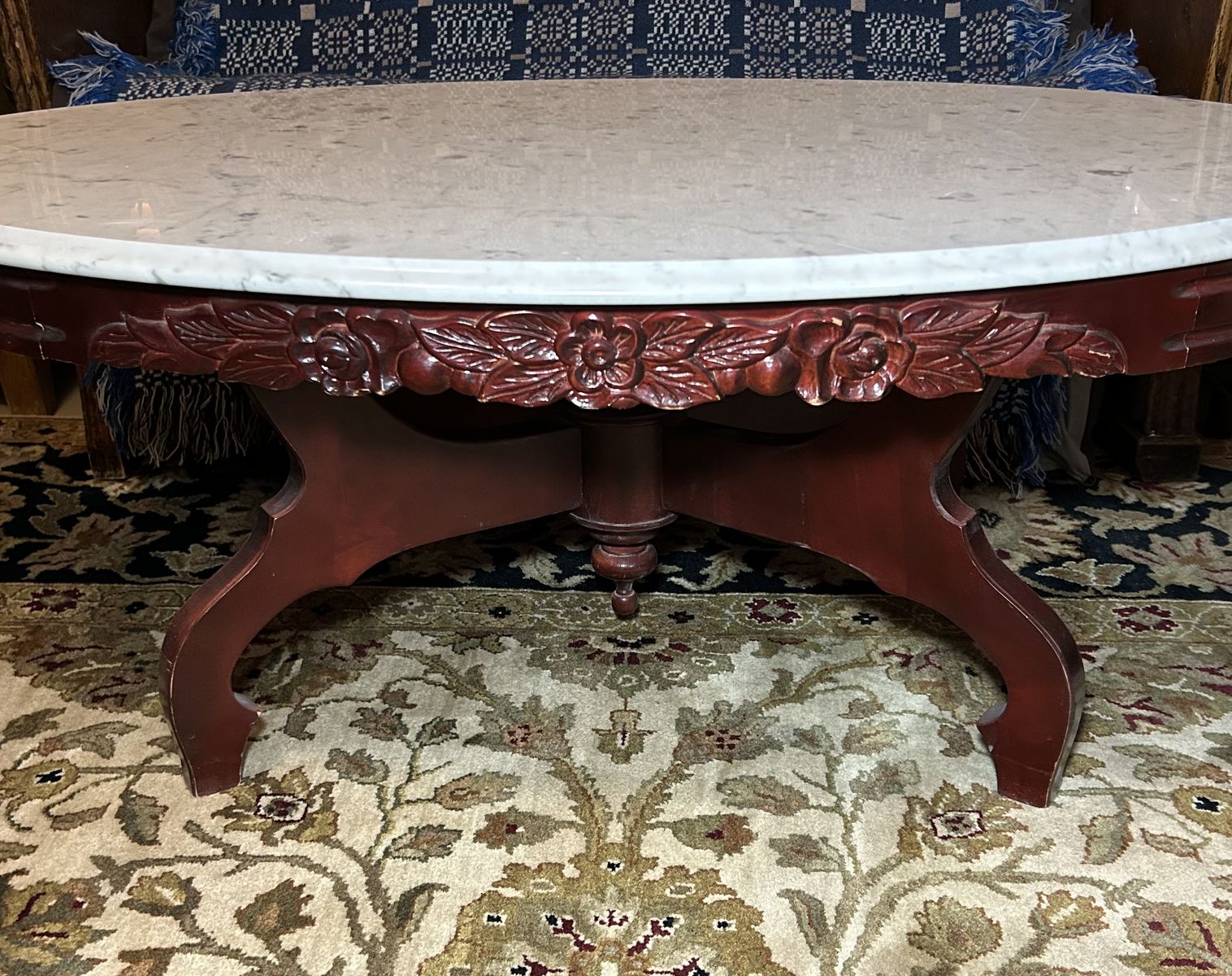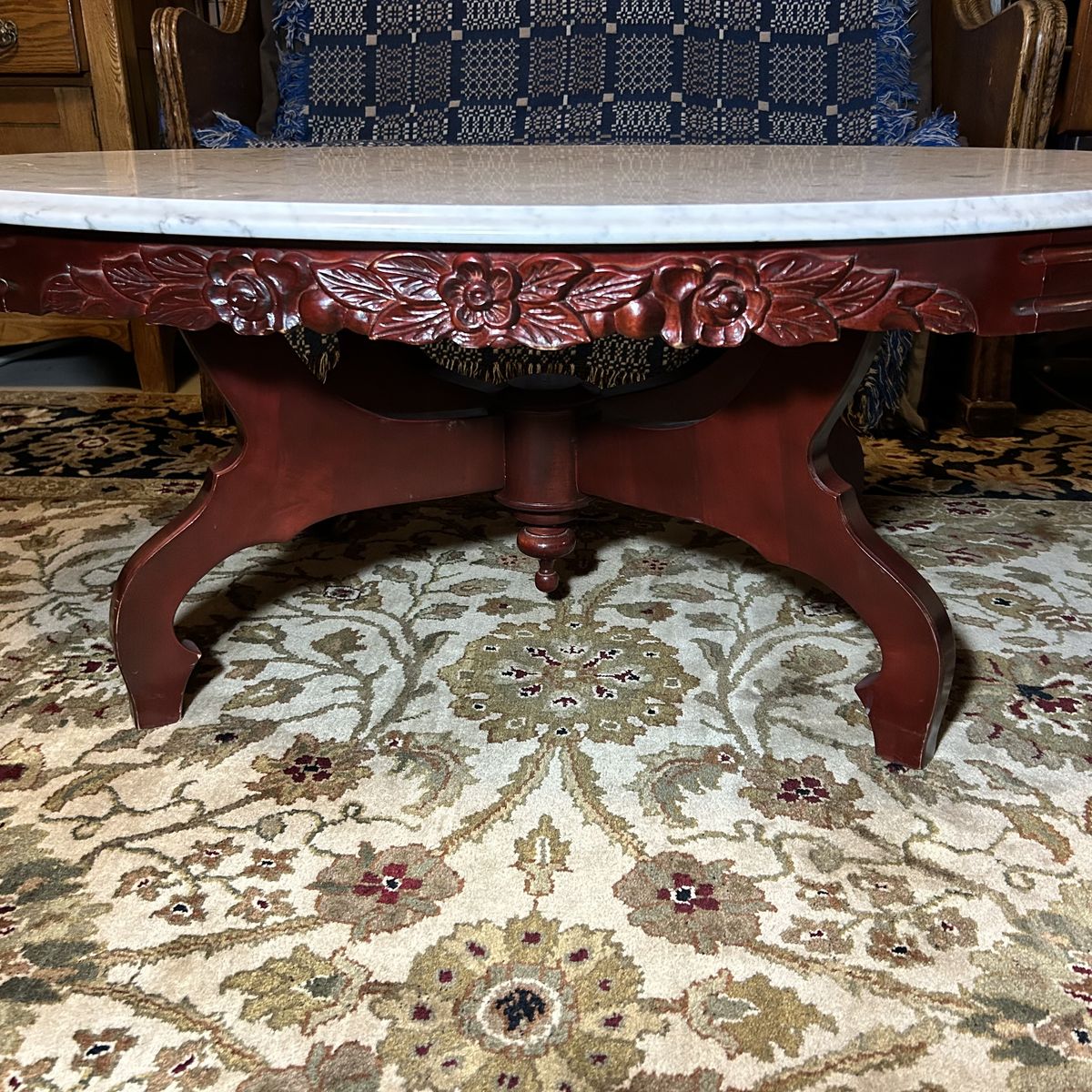 Coffee table made of a solid piece of Italian Marble that weighs about 120+ pounds with a base of Solid Maple carved along the rim with an intricate floral design is a classic and sophisticated edition to any home. Delivery available to a convenient location when in your area for $5.