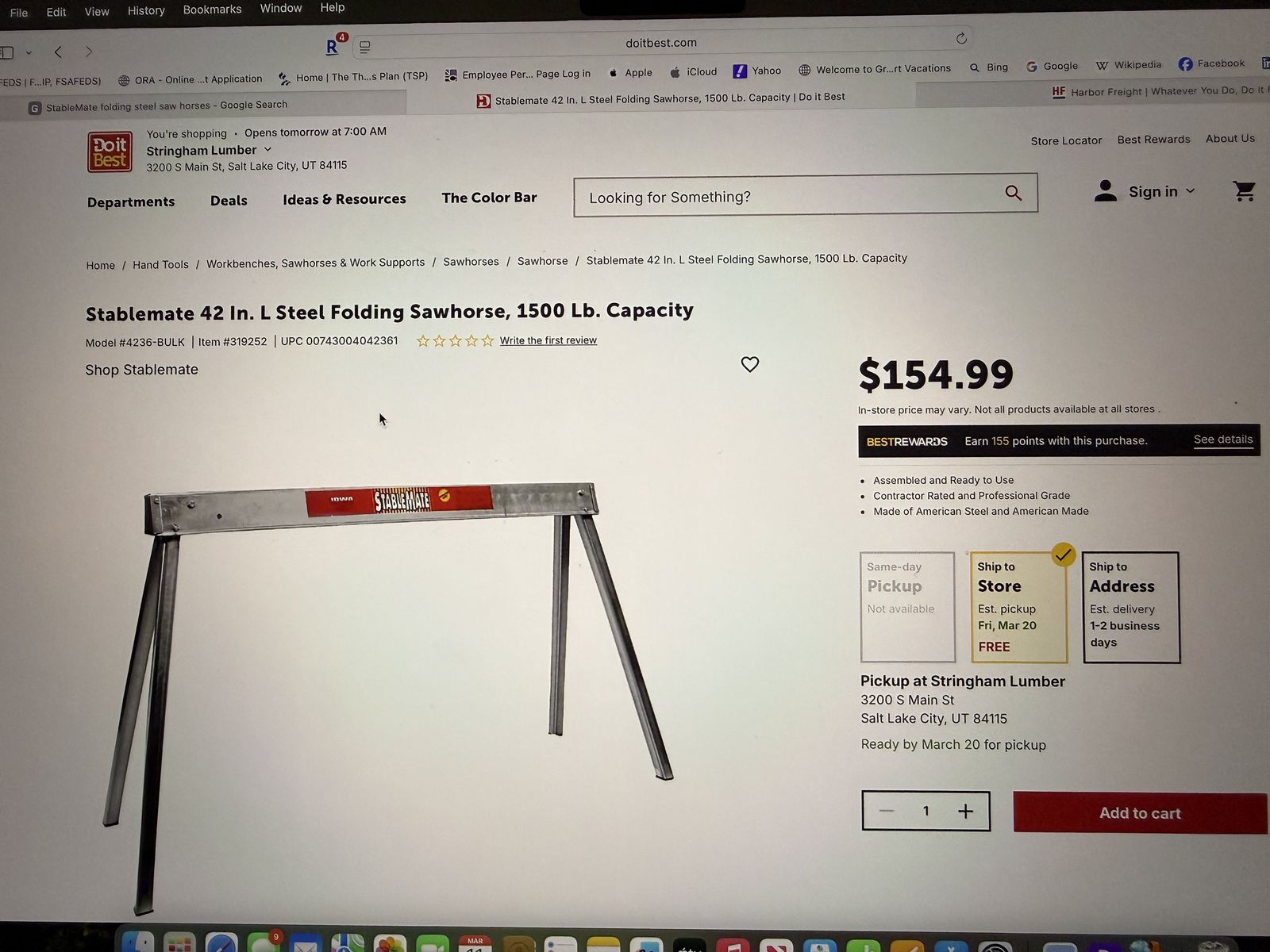 Zelle1 Stablemate 42 In Steel Folding Sawhorse, 1500 Lb capacity Product overview A StableMate Professional Grace Sawhorse will be the last sawhorse you will ever need as it is made to withstand the toughest of projects. Each sawhorse folds up for easy storage and transporting, and has a weight capacity of 1,500 pounds. Stablemate Sawhorses are great for house projects, painting, building, power tool stands, and more. (1 only - not a set) Assembled and Ready to Use Contractor Rated and Professional Grade Made of American Steel and American Made Locking Legs fold into frame for Compact, Easy Carrying and Storage Includes Non-Skid Rubber Feet Pre-Drilled Holes for use with Wood Top (Wood not included) Weight Capacity: 1,500 lbs. each; 3,000 lbs. per pair Specifications MaterialSteel Capacity1500 lb. Width (In.)42 Height (In.)36