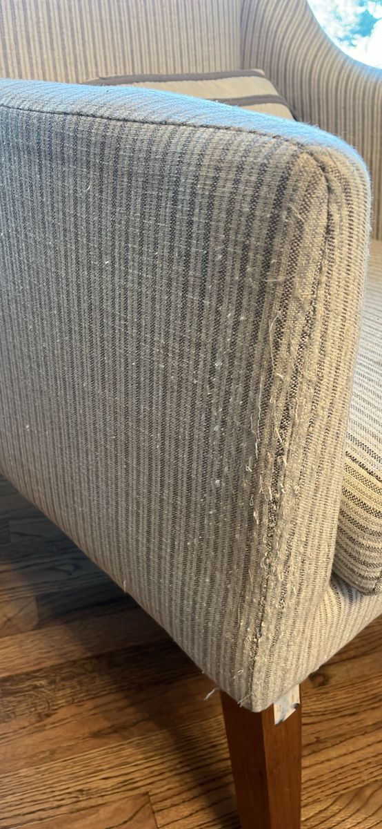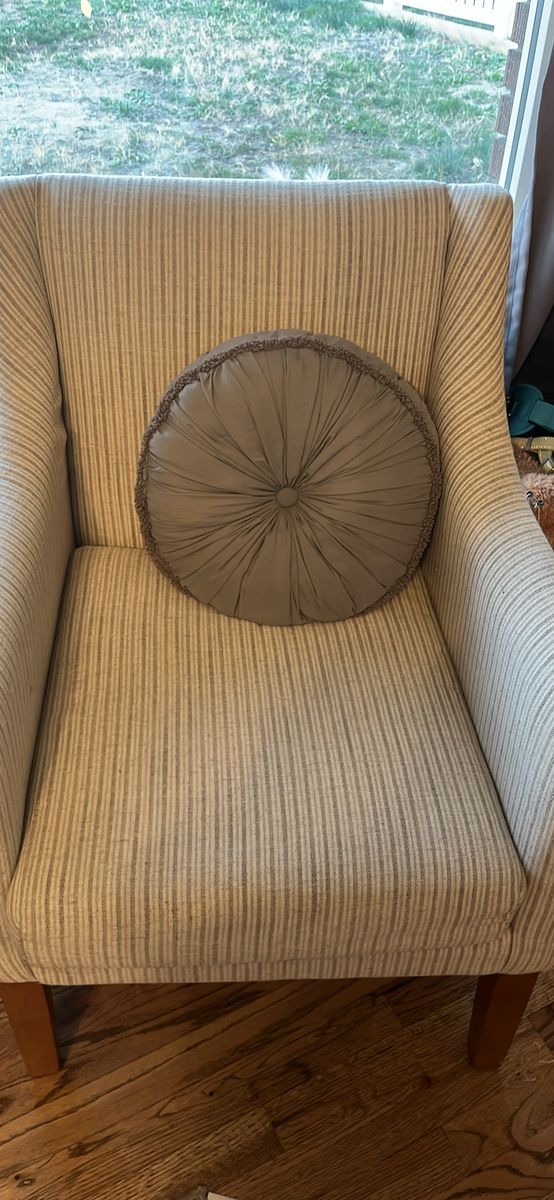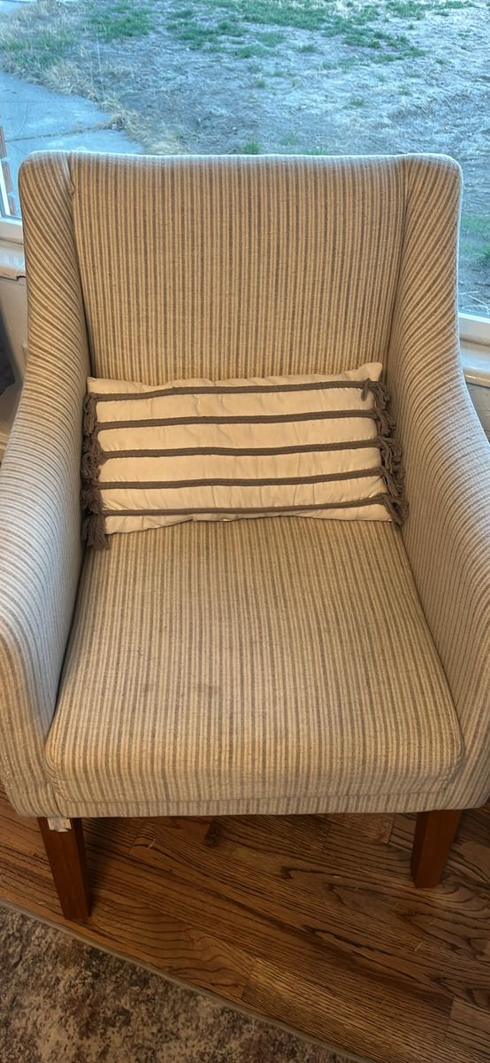 VenmoOther than a small stain on one of the cushions (can be washed out, I haven’t had time) these are great chairs. They are perfect height if you’d also like to use them at your kitchen table. Had some slight pilling from the fabric as seen in the pictures. $150 for both.