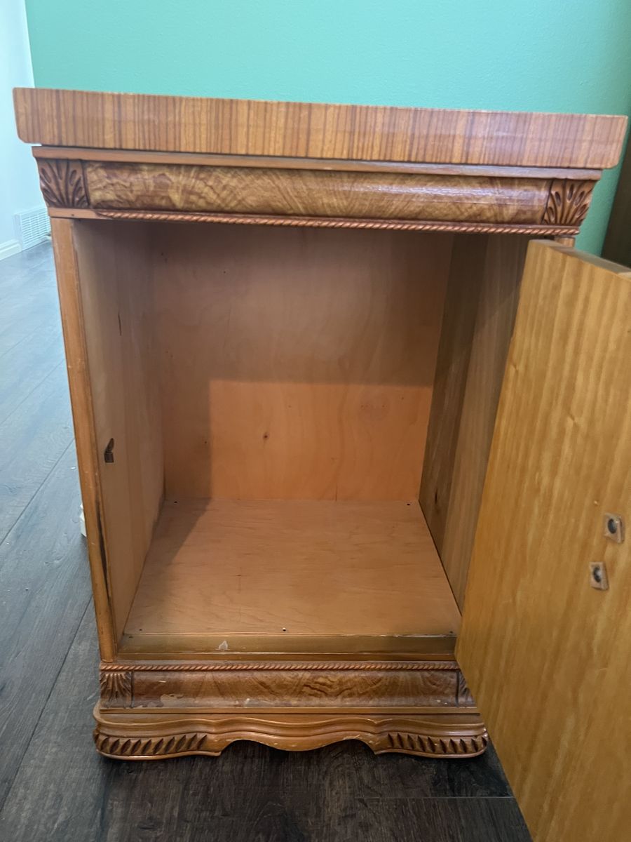 VenmoThis item is a vintage Art Deco style nightstand or bedside cabinet from the 1930s, constructed from mahogany or walnut veneer with distinctive bakelite hardware. Door opens and closes easily. There is a chip on the veneer on the top side. 18 wide 14 deep 27.5 tall Pick up in Herriman. Pet and smoke free home. Cash or Venmo. $60. listed for a client