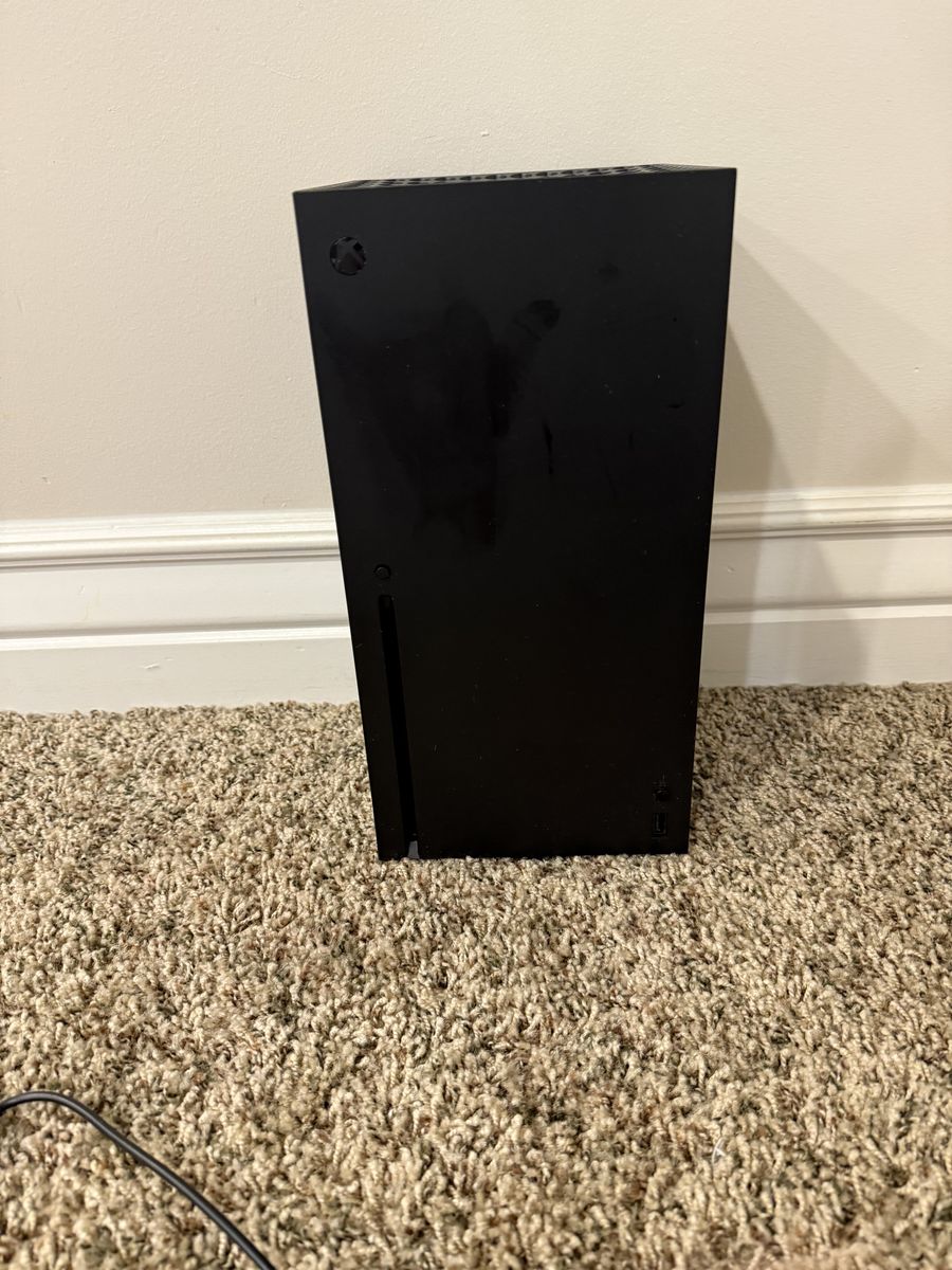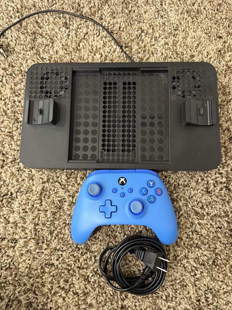 ApplePayComplete Xbox Series X console bundle. It has the black Xbox Series X console, a cooling stand with two controller charging docks, one blue Xbox controller, and power cable.